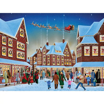 Step into a festive winter wonderland with Don Engler’s charming holiday puzzle, where a bustling Christmas village comes to life under a starlit sky. Shoppers stroll through snow-covered streets, admiring holiday window displays and carrying beautifully wrapped gifts. Carolers dressed in traditional attire fill the air with joyful melodies, spreading the holiday spirit. Above, Santa and his reindeer soar across the sky, leaving a magical trail as they embark on their Christmas Eve journey.