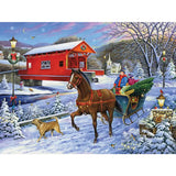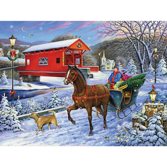 This jigsaw puzzle is designed by Oleg Gavrilov and available in multiple piece count. Puzzles are perfect for both intermediate puzzle enthusiasts and group activities. In a winter scene, a spirited dog runs alongside a horse pulling a sleigh, their owner guiding the way. The sleigh is laden with a freshly cut Christmas tree.