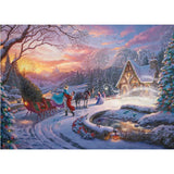 Step into a fairytale winter wonderland with this enchanting 1000-piece jigsaw puzzle designed by Thomas Kinkade, measures 19" x 26-3/5". A snow-covered cottage glows warmly at sunset as a prince and princess arrive by horse-drawn sleigh, creating a magical moment frozen in time. Twinkling lights, gently falling snow, and rich pastel colors bring the holiday spirit to life in true Kinkade fashion. A serene and nostalgic puzzle perfect for cozy winter days.
