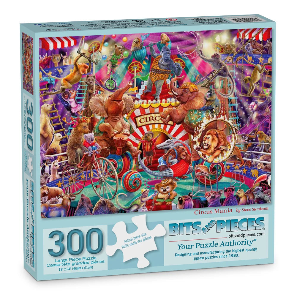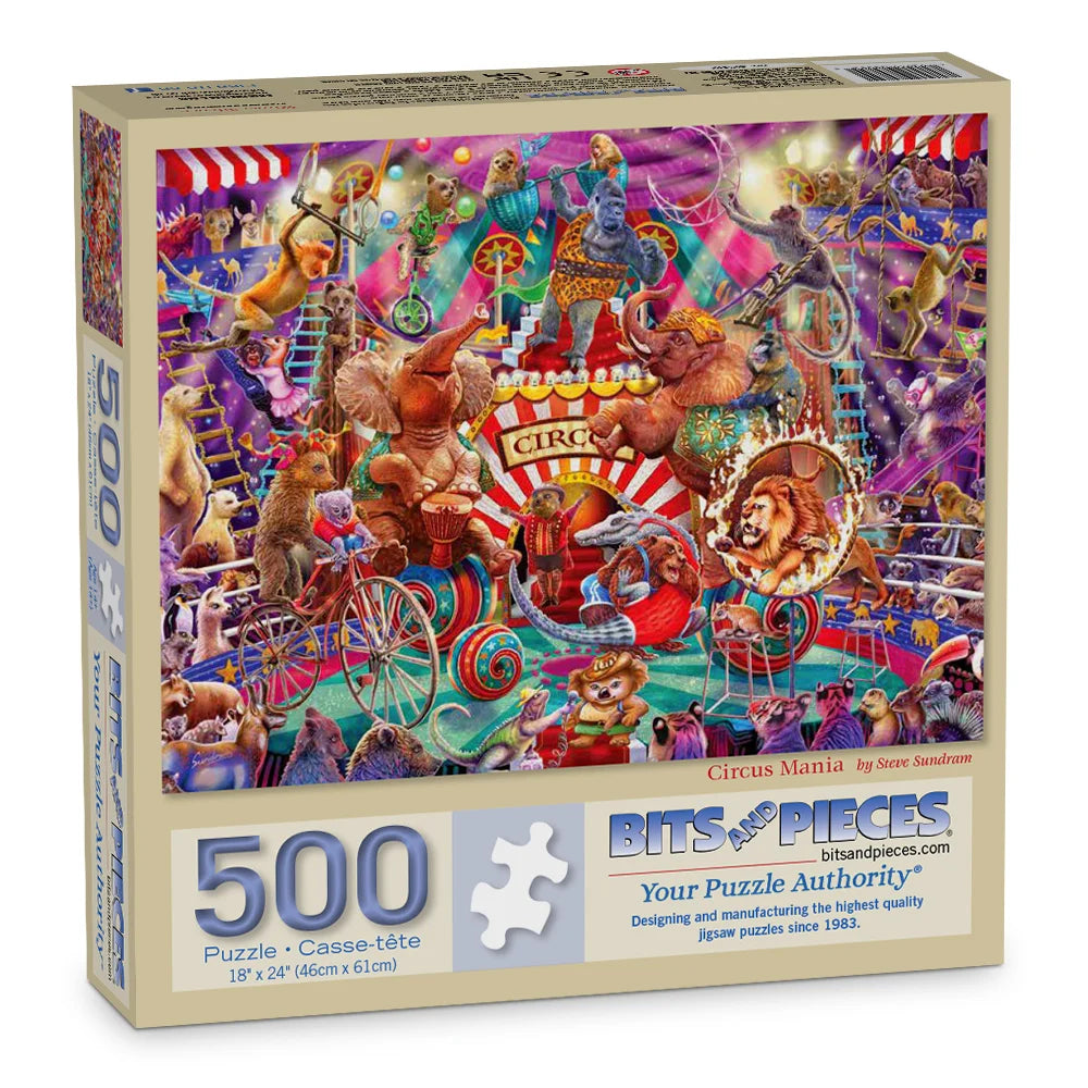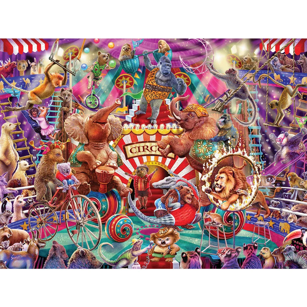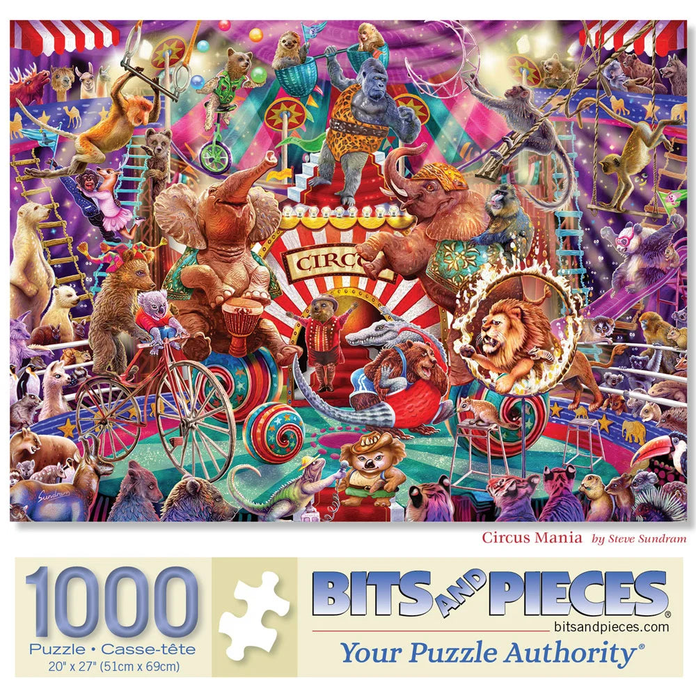Circus Mania by Steve Sundram explodes with color and action as performers, animals, and carnival wagons fill the ring. A high-energy jigsaw puzzle for those who love vibrant art and playful detail.