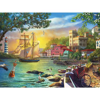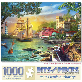 Transport yourself to a serene waterfront with "City Embankment at Sunset," a beautifully designed puzzle by Image World. This stunning scene features a charming harbor with vibrant buildings, a majestic sailing ship, and a glowing sunset reflected in tranquil waters. Seagulls and lush greenery add to the idyllic atmosphere, evoking the peaceful allure of coastal living. Perfect for lovers of maritime art and picturesque landscapes, this puzzle brings a slice of paradise to your home. Dive into the beauty of a golden evening by the sea with this captivating design.