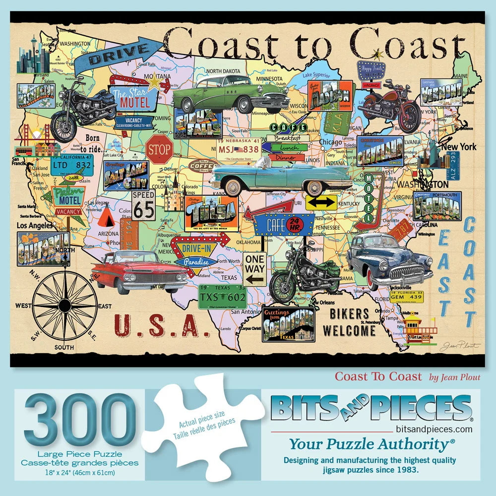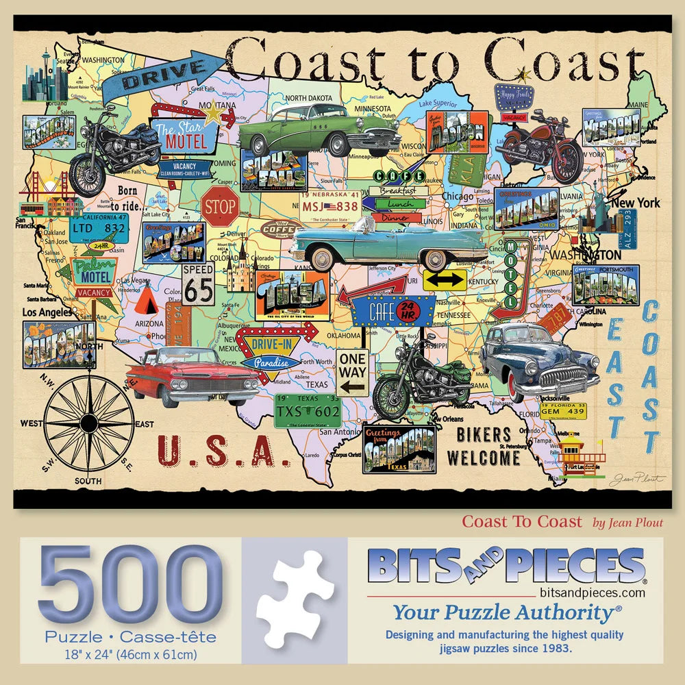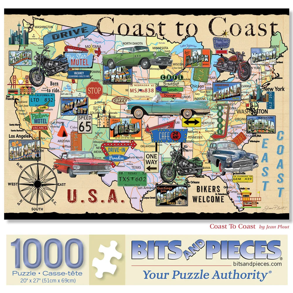 Hit the open road with the Coast to Coast jigsaw puzzle by Jean Plout, a travel-themed collage packed with postcards, signs, and roadside charm from every corner of the U.S.A. From Route 66 to state landmarks, it’s a scenic tour in puzzle form.