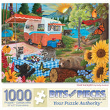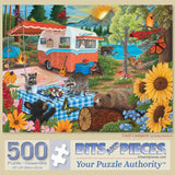 "Cool Campers" by Kathy Bambeck captures a delightful camping scene where animals and nature come together for a playful outdoor picnic. Featuring raccoons, bears, and vibrant sunflowers alongside a charming vintage camper, this design is filled with whimsical details. Perfect for puzzle enthusiasts who love the outdoors, this piece offers a relaxing escape into a lively woodland setting.