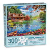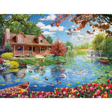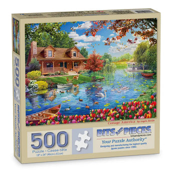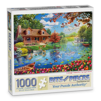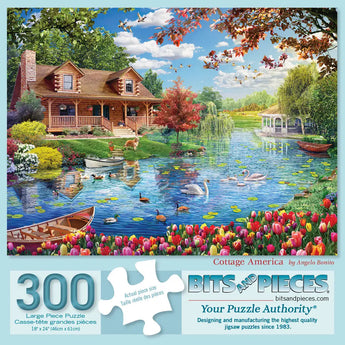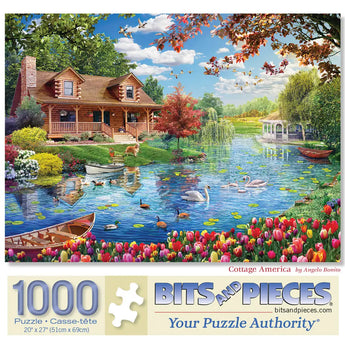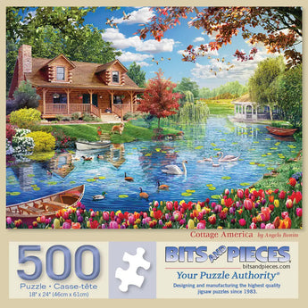 Escape to a tranquil countryside retreat with Cottage America by Angelo Bonito. This picturesque puzzle captures a serene log cabin nestled by a shimmering lake, surrounded by vibrant tulips, lush gardens, and majestic willow trees. Ducks and swans glide peacefully across the water, while a golden retriever waits patiently by the dock. The gazebo and rustic rowboats add to the charm, creating a scene that exudes peace and nostalgia. Bring this peaceful vision of Americana to life, one puzzle piece at a time!