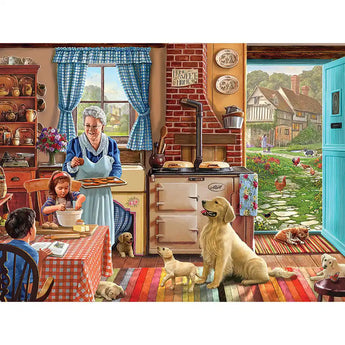 This jigsaw puzzle is designed by Steve Crisp and available in multiple piece count. A day in Grandma's cottage means fresh baked cookies! The dogs wait; hopeful for their treat! The chickens stay outside enjoying the sunshine.