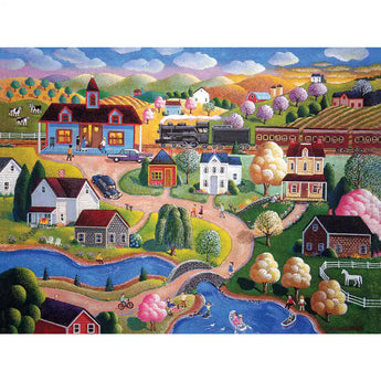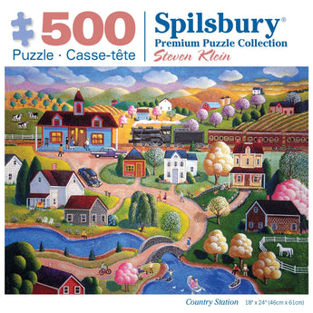All aboard for a delightful journey through small-town charm with Country Station! A vintage train rolls into the station, bringing excitement to the quiet countryside. Neighbors gather, children play by the stream, and horses graze near cozy homes. With its rolling hills, blooming trees, and winding roads, this nostalgic scene by Steven Klein captures the warmth of rural life. Large, easy-to-handle pieces make it a joy to assemble!