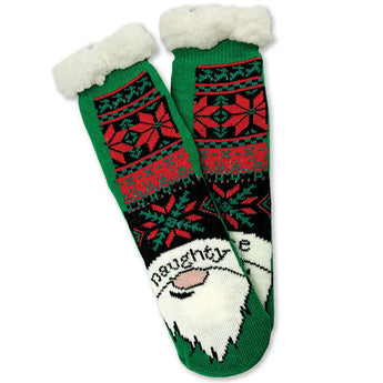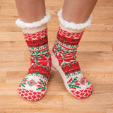 Keep cozy and warm in these festive holiday themed socks. These thick socks are perfect for layering or relaxing at home. Acrylic/polyester/rubber. One size fits most. Imported