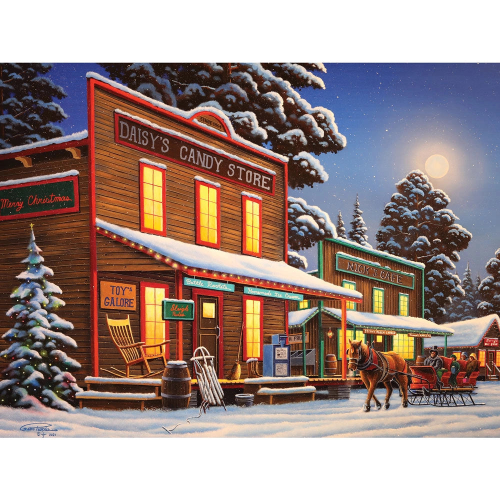 Immerse yourself in the charm of a wintry night with our enchanting puzzle. Moonlight gently bathes Daisy’s Candy Store, casting a soft glow over the snow-covered streets. In front of the shop, a beautifully adorned horse and carriage adds a touch of nostalgic elegance to the scene. As you piece together this serene winter tableau, enjoy the tranquil beauty of the snow-draped landscape and the cozy allure of the candy store. Perfect for a relaxing evening or a heartfelt gift, this puzzle captures the essence of a peaceful, candy-filled winter wonderland, inviting you to experience the magic of Daisy’s Candy Store. This puzzle is designed by Oleg Gavrilov, and available in 300- and 1000- piece count.