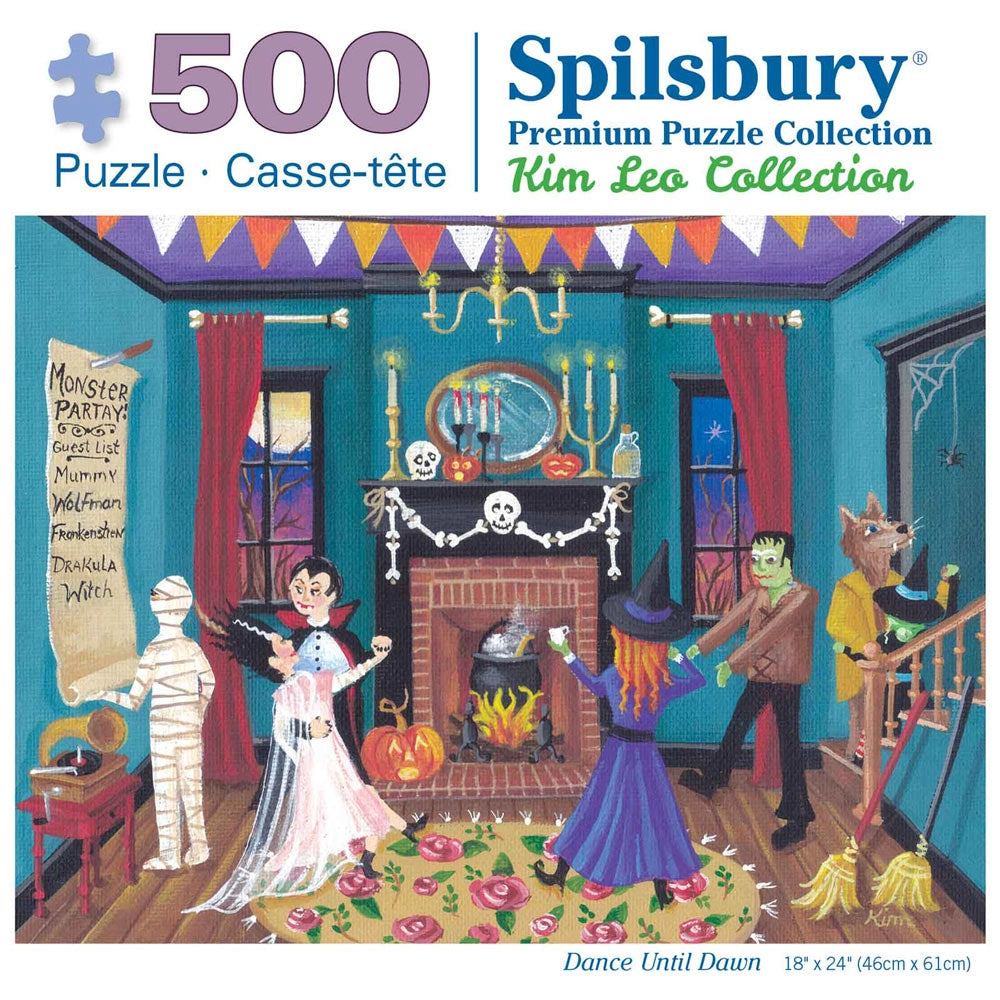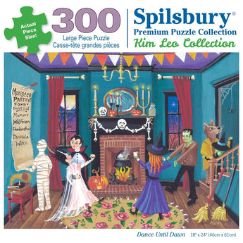 Step into a festive Halloween celebration with Dance Until Dawn, a jigsaw puzzle by Kim Leo. This whimsical scene invites you to join Dracula, Frankenstein, and their monster friends as they groove the night away in a lively ballroom filled with spooky decorations and holiday spirit. Perfect for family puzzle nights or seasonal fun, this puzzle captures the playful charm of Halloween.