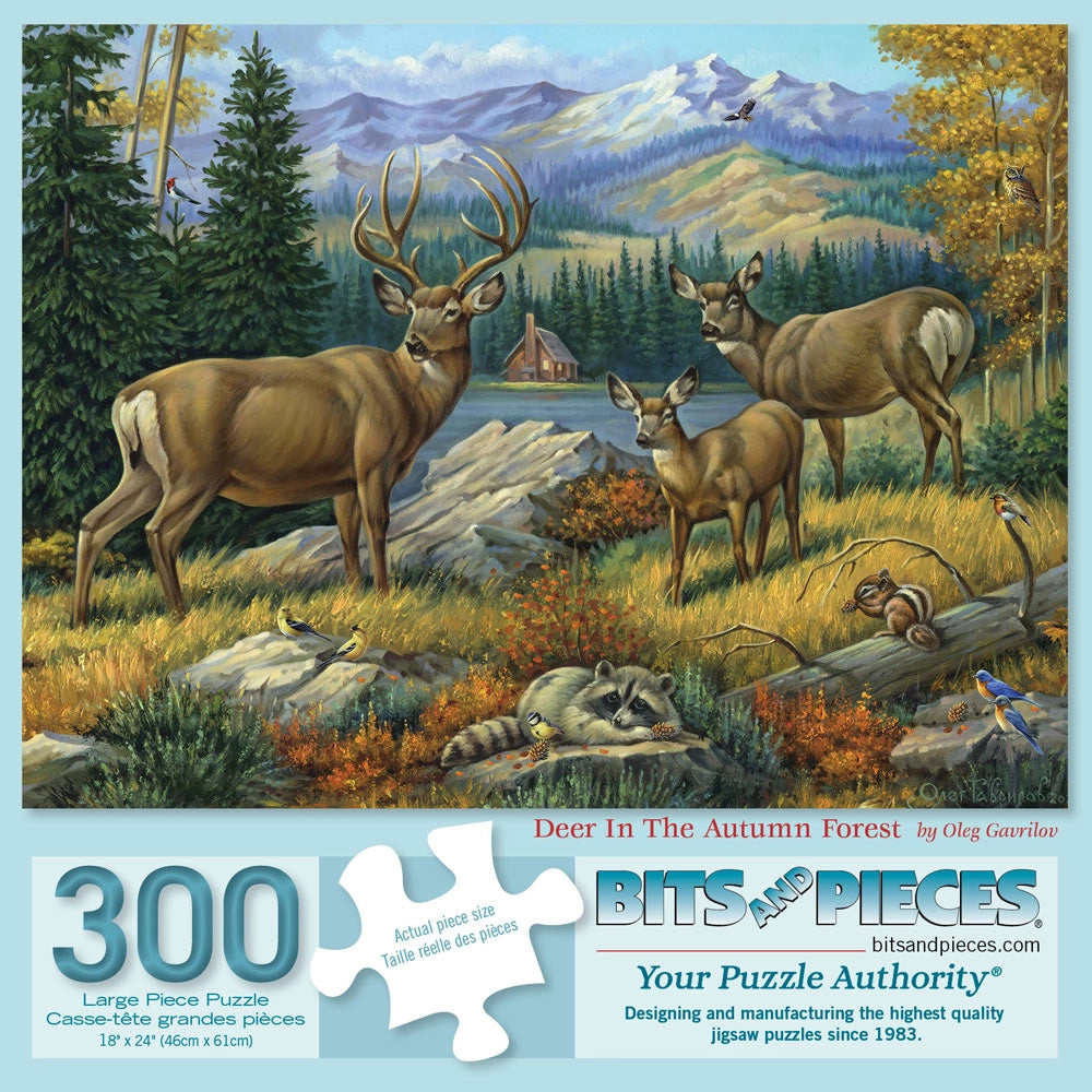Immerse yourself in the tranquil beauty of fall with this stunning puzzle by renowned artist Oleg Gavrilov. Featuring a family of majestic deer gracefully nestled amidst muted autumn foliage, this scene captures the essence of the season in exquisite detail. Set against a backdrop of breathtaking mountains, the puzzle showcases the rich hues of fall, from rich greens to deep rust and golden yellows. Whether you choose the 300-piece or 1000-piece version, each piece reveals the meticulous artistry and serene charm of Gavrilov’s work perfect for puzzle enthusiasts and nature lovers alike, this captivating image invites you to enjoy the peaceful elegance of a family of deer in their autumnal habitat. Experience the joy of assembling this beautiful scene and bring a touch of nature's splendor into your home.