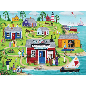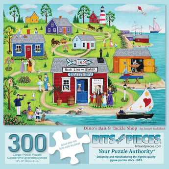 Cast your line and reel in the delight of piecing together this charming jigsaw puzzle. Crafted by the keen eye of Joseph Holodook, this quaint village scene invites you to a lively coastal escapade at a legendary bait and tackle shop. Each puzzle piece unfolds stories of local anglers and vibrant community life by the seaside. Whether you're a puzzling novice or a seasoned assembler, this puzzle promises a catch of satisfaction and fun. And for those who yearn for even more intricate details, it's available in an multiple piece count. Dive into this picturesque puzzle and let the seaside serenity wash over you. Puzzles are perfect for both intermediate puzzle enthusiasts and group activities.
