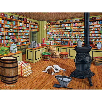Take a step back in time with Dog Day Afternoon, a charming 500-piece puzzle by Don Engler that measures 18" x 24". This inviting scene captures a nostalgic general store, complete with wooden shelves stacked high with colorful goods and a cozy wood stove. A loyal dog naps peacefully on the warm floor, adding a touch of tranquility to this vintage setting.