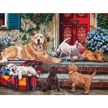 These playful pups are enjoying a sunny day on the front porch, surrounded by colorful flowers and the comfort of home. Designed by Art World, this jigsaw puzzle is available in both 300- and 500-piece options, making it a delightful challenge for dog lovers and puzzlers of all ages. With its cozy setting and adorable Labrador retriever family, it’s a heartwarming addition to any collection.