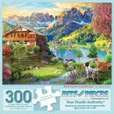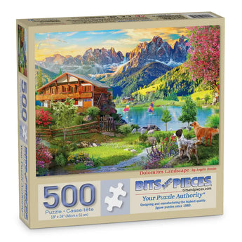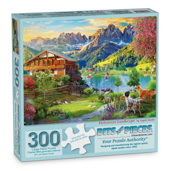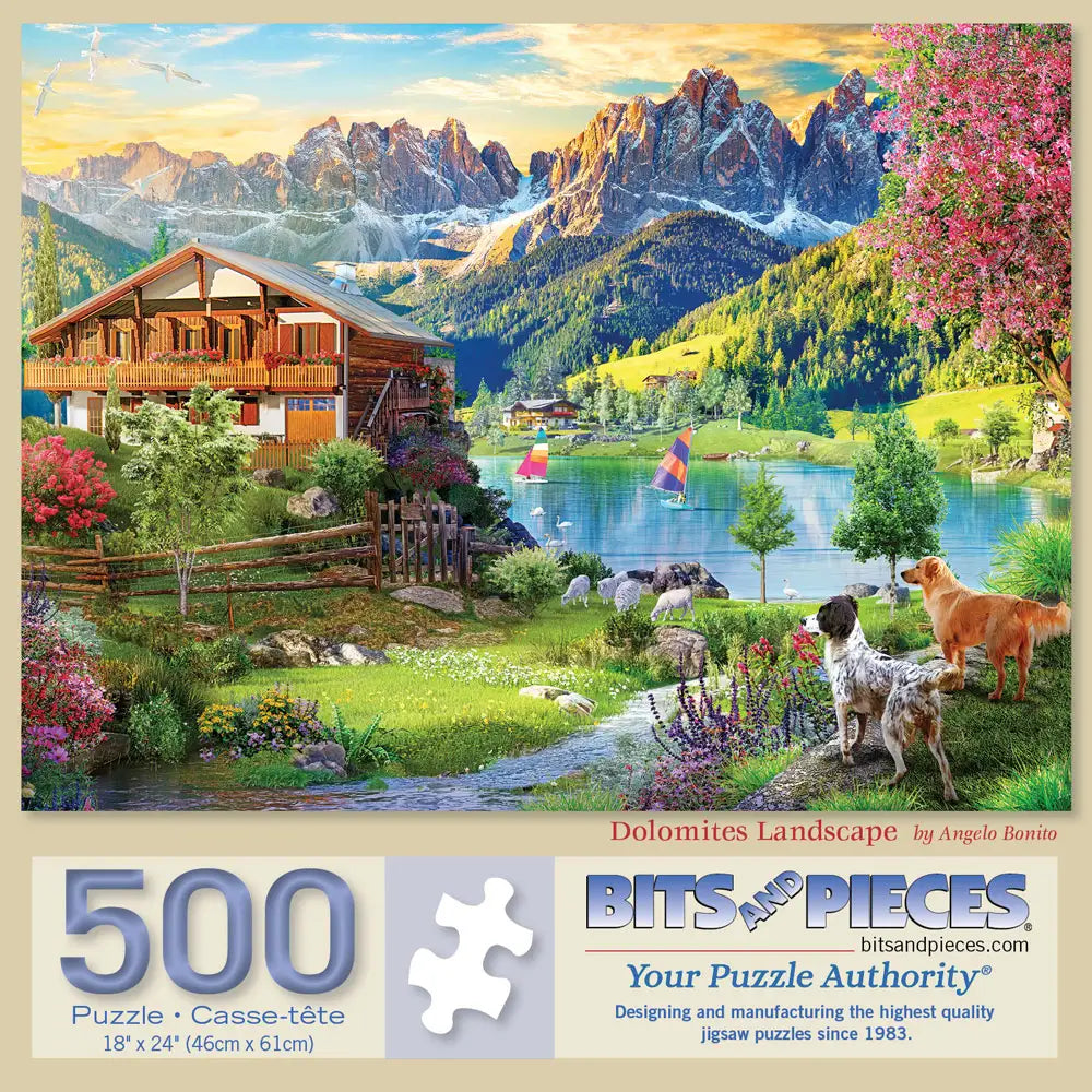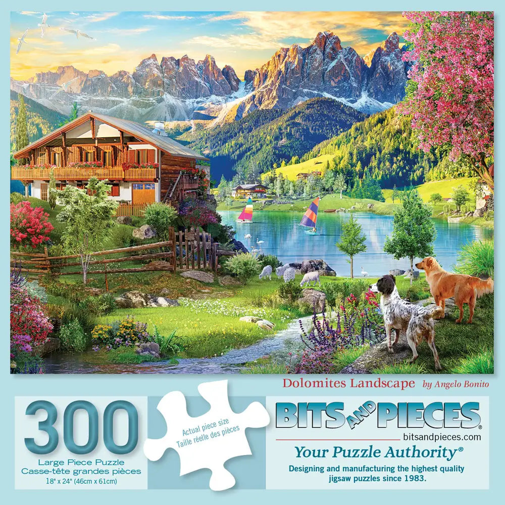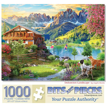Immerse yourself in the breathtaking beauty of the Italian Alps with Dolomites Landscape by Angelo Bonito. This stunning puzzle features a charming chalet framed by vibrant flowers, rolling green meadows, and a sparkling lake dotted with sailboats. In the foreground, playful dogs enjoy the serene countryside, while majestic peaks rise dramatically in the background, illuminated by the golden hues of sunset. Experience the magic of this alpine paradise, piece by piece!