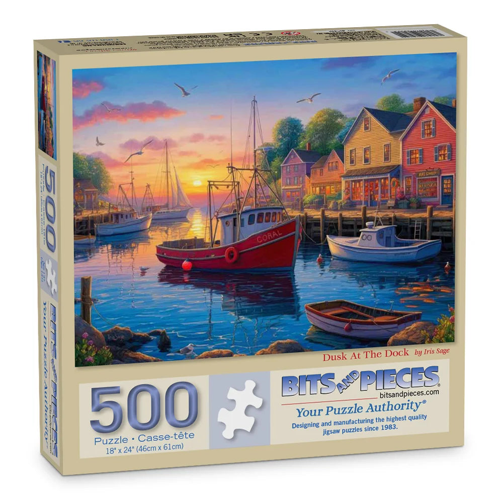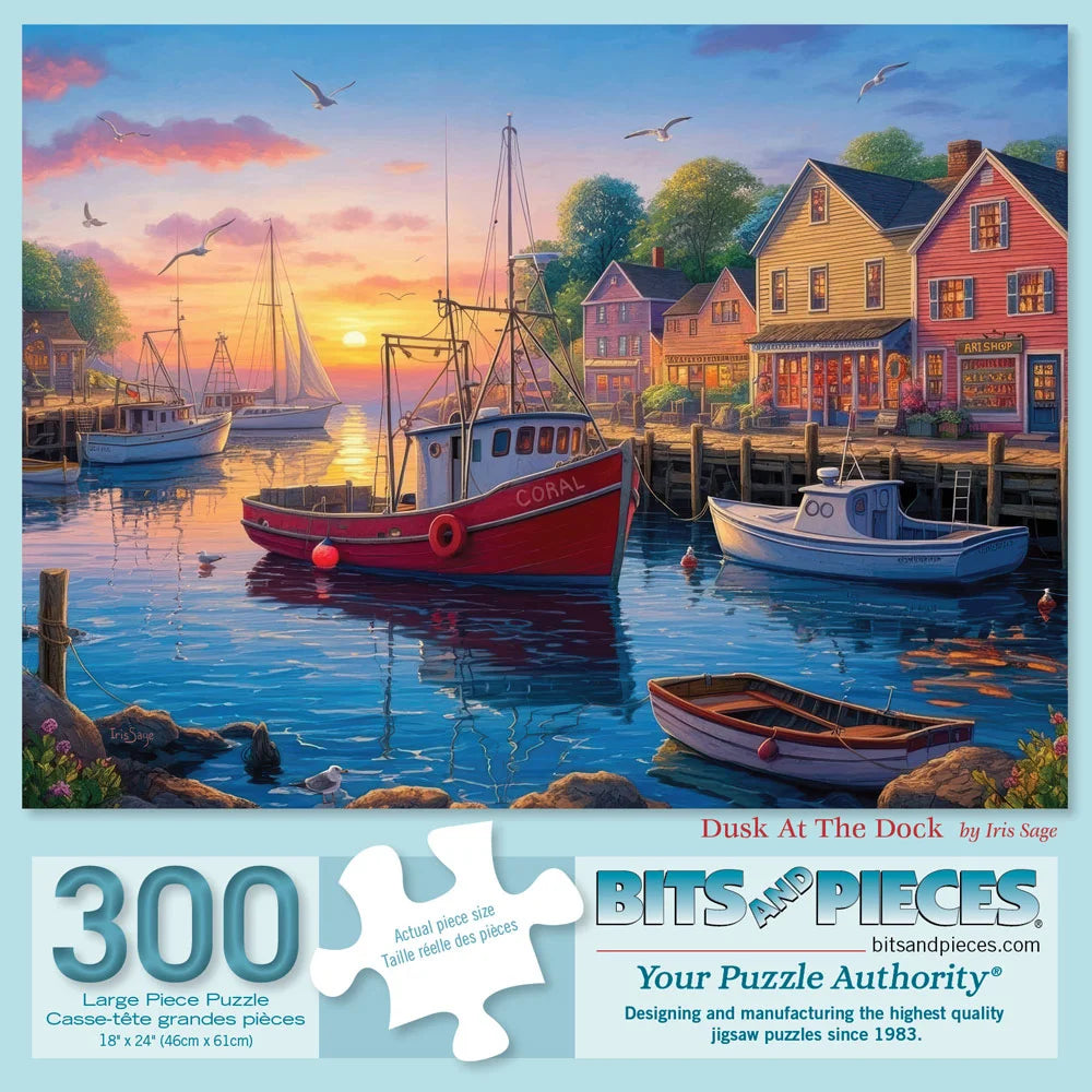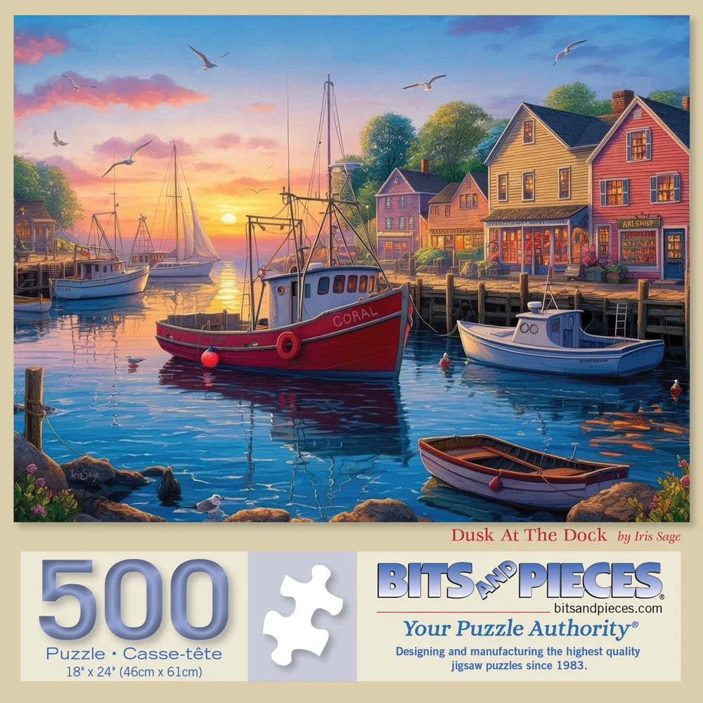 In Dusk At The Dock, Iris Sage paints a harbor at sunset, where fishing boats rest against a colorful village backdrop. The glowing sky reflects on the water, making this coastal puzzle a serene and picturesque escape.