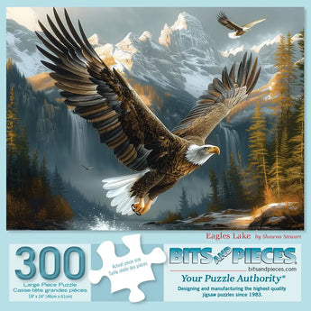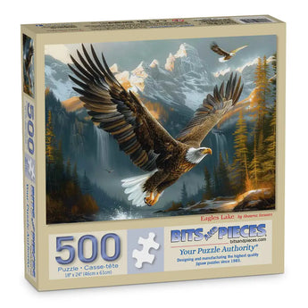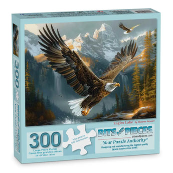 Soar through the breathtaking wilderness with Eagles Lake by Shawna Stewart. This striking puzzle captures the majesty of bald eagles gliding over a serene mountain lake, surrounded by towering pines and snow-capped peaks. The dynamic composition and stunning natural details transport you to a world of freedom and tranquility. Perfect for nature enthusiasts, this puzzle is a celebration of the wild’s untamed beauty.