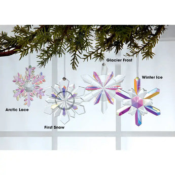 Let it snow! Adorn your holiday tree with these iridescent snowflake ornaments. Molded and carved of reflective glass crystal in unique 3-D relief with an aurora borealis finish. Perfect for hanging in a sunny window where they catch the light for a shimmering effect. 4" diameter, with a 5" silver hanging ribbon.