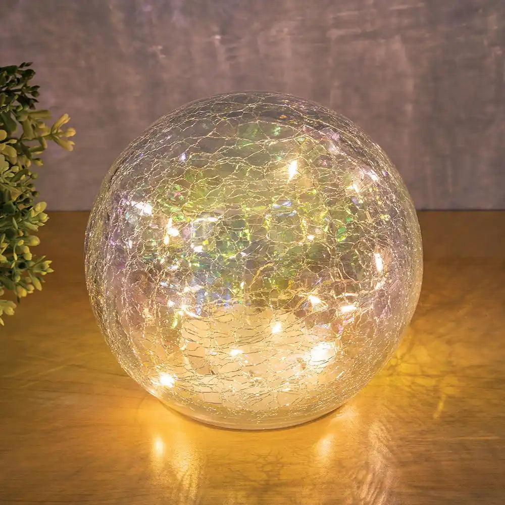 This light up globe creates a cozy atmosphere to your space. A string of 15 LED lights sit in an elegant hand-blown crackle glass globe for a whimsical and romantic piece of décor. Perfect for indoor and outdoor use. LED bulbs that are designed to last for over 100,000 hours! Battery operated with an ON/OFF switch. 6" diameter.