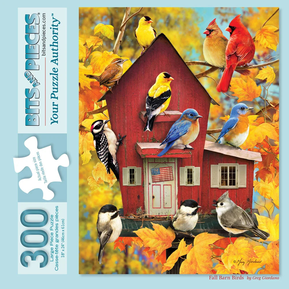 Fall Barn Birds by Greg Giordano celebrates the season with colorful birds perched around a red barn framed by golden autumn leaves. A lively fall puzzle perfect for bird lovers.
