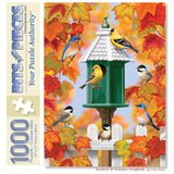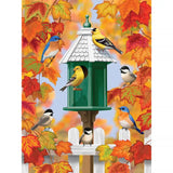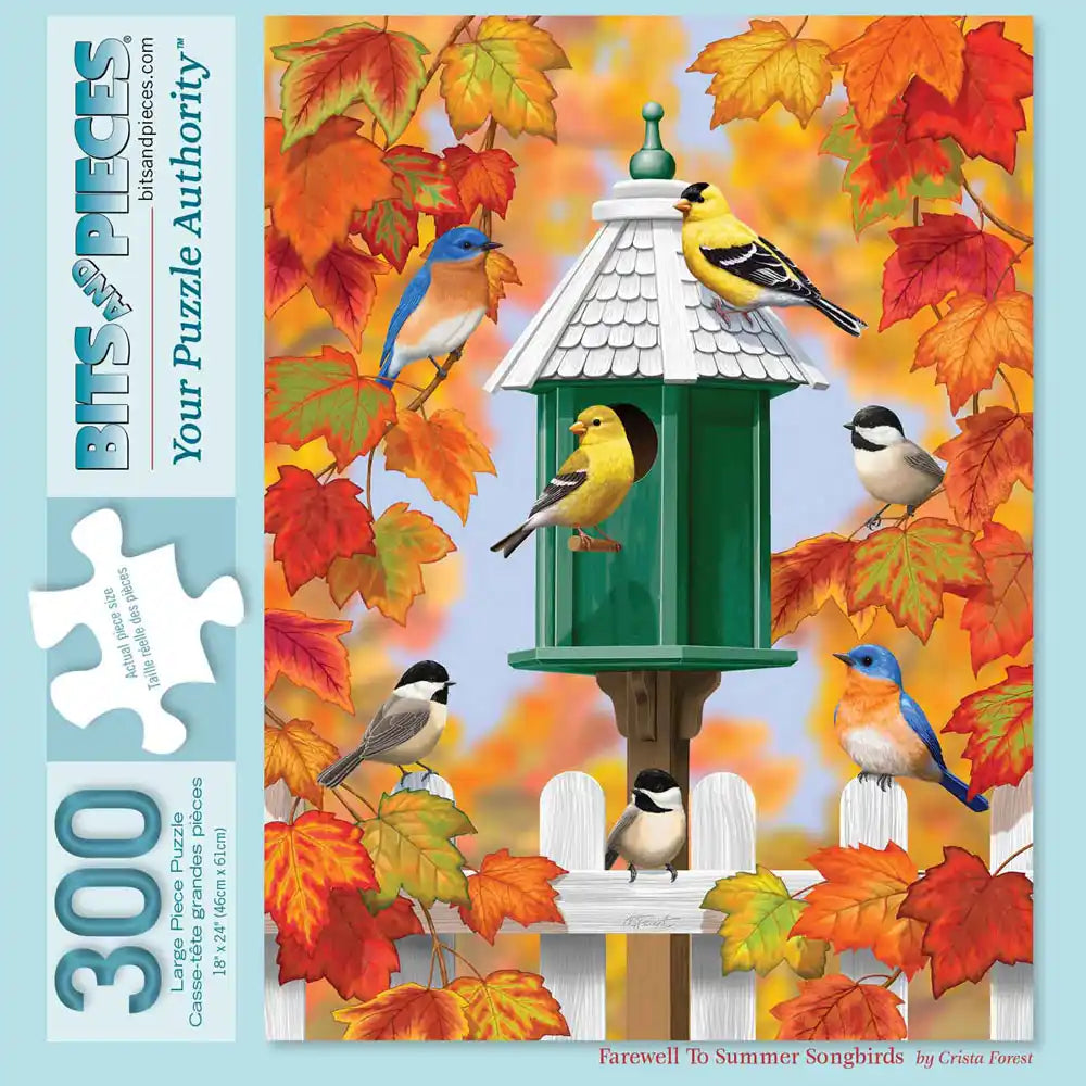 Celebrate the beauty of songbirds with Crista Forest's "Farewell to Summer Songbirds." This charming puzzle features vibrant goldfinches, bluebirds, and chickadees gathered around a green birdhouse, framed by brilliant autumn leaves. The scene captures the seasonal transition with warm, glowing hues, making it a delightful piece for nature lovers and bird enthusiasts. Add a touch of serene autumn ambiance to your puzzle collection.