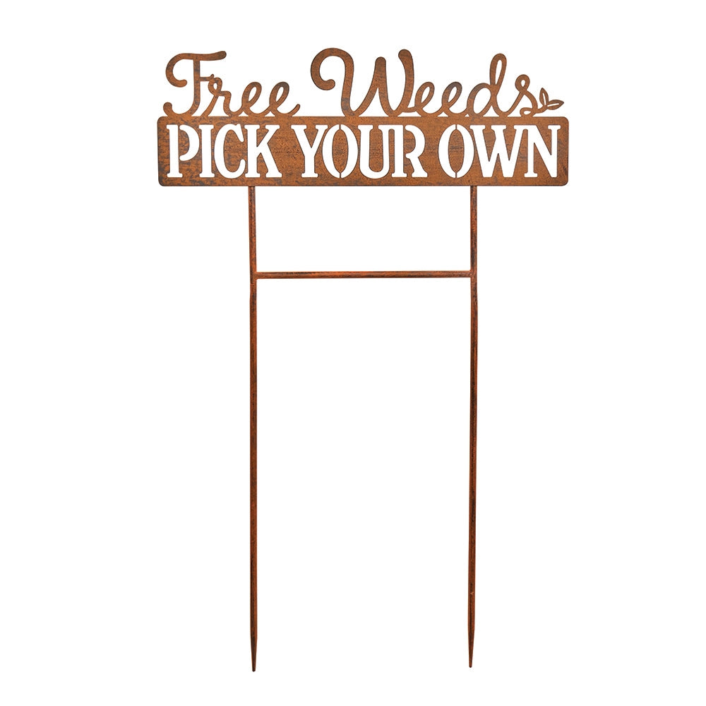 Add a lighthearted touch to your outdoor space with the Free Weeds Garden Sign. Crafted from sturdy iron, this charming yard stake features a cut-out message that reads “Free Weeds Pick Your Own.” The dual-prong design allows for easy and secure placement in soil or mulch, making it a fun and durable accent for flower beds, walkways, or vegetable gardens. A gentle wink to fellow gardeners who appreciate a little humor with their blooms. Measures 28 inches high by 18 inches wide.