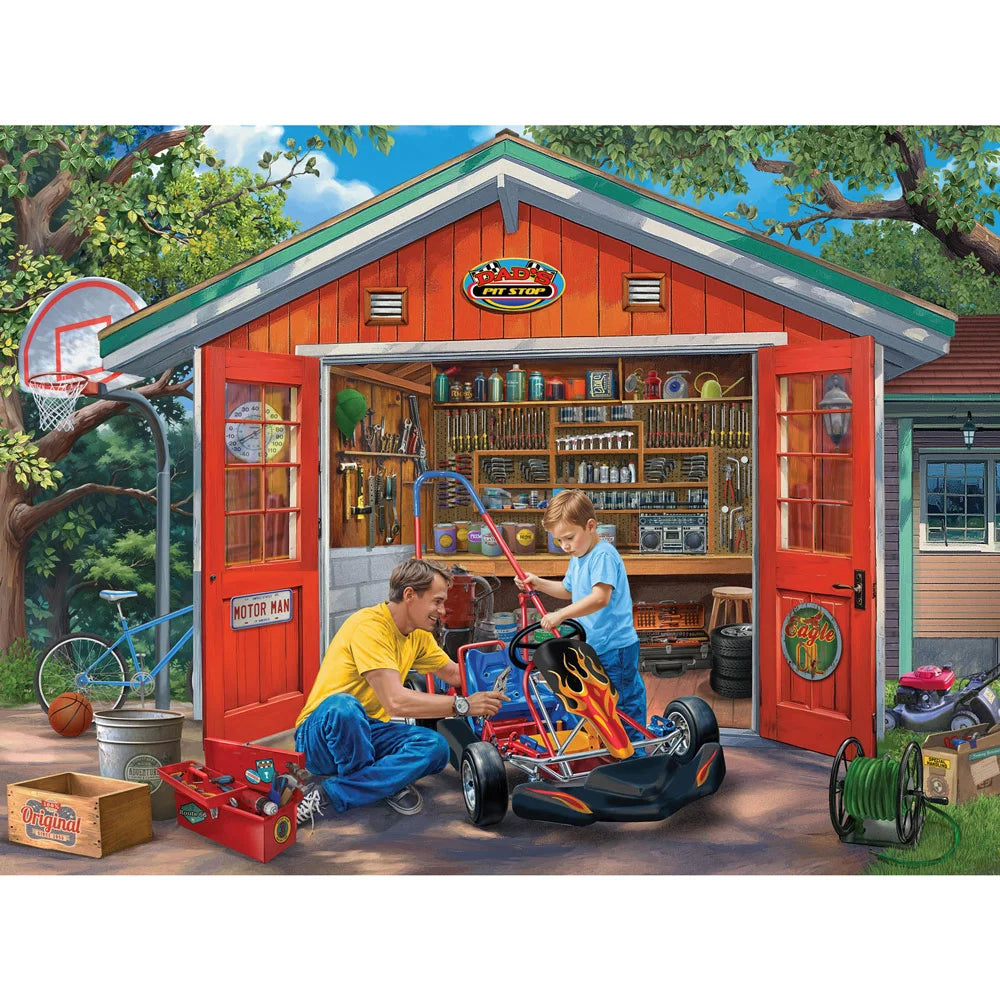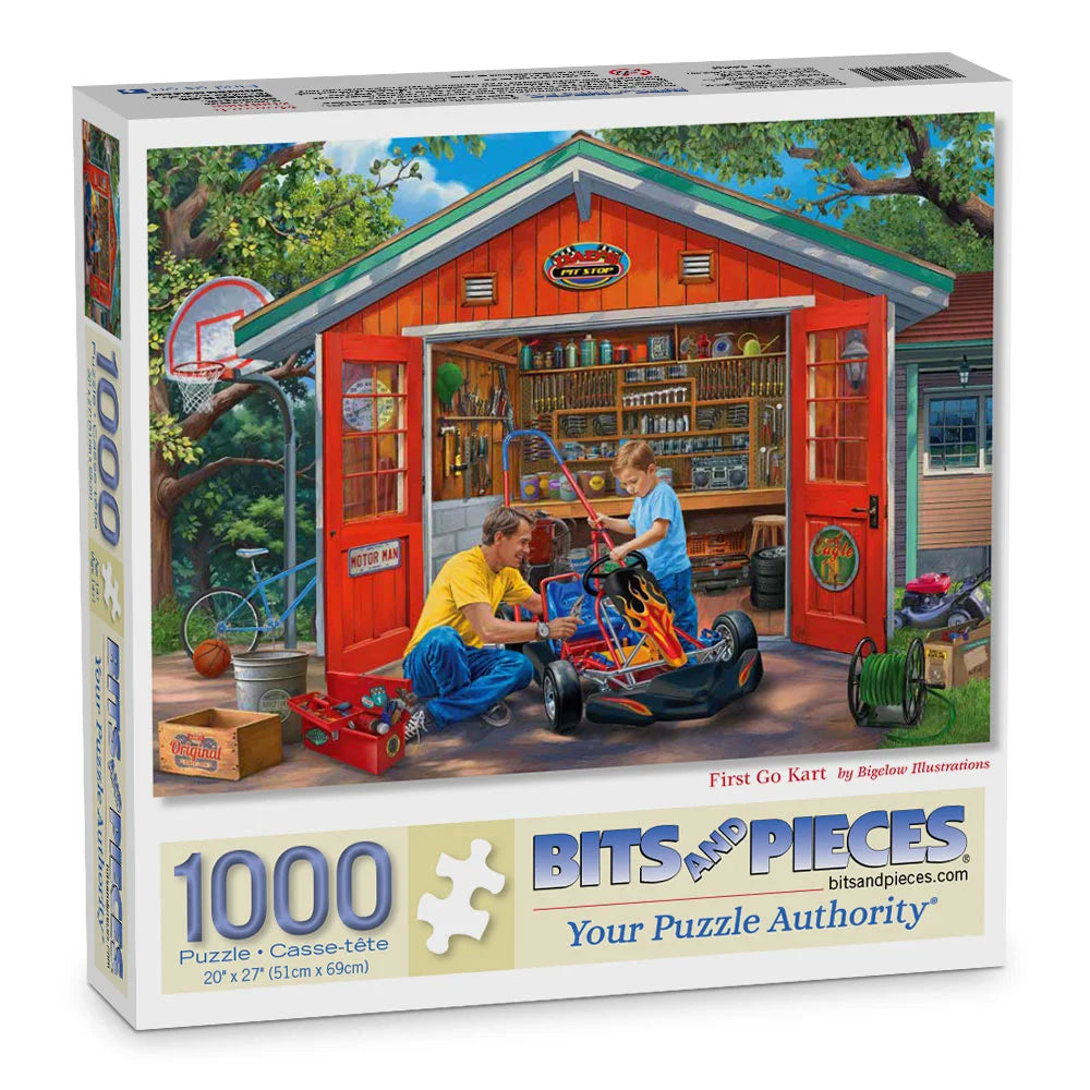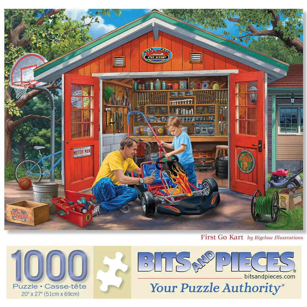 Rev up the memories with the First Go Cart jigsaw puzzle by Bigelow, where a father and son tinker in their garage, building more than just wheels—they’re building a bond. The red workshop bursts with tools, toys, and timeless energy, capturing a moment of hands-on fun and backyard ambition.