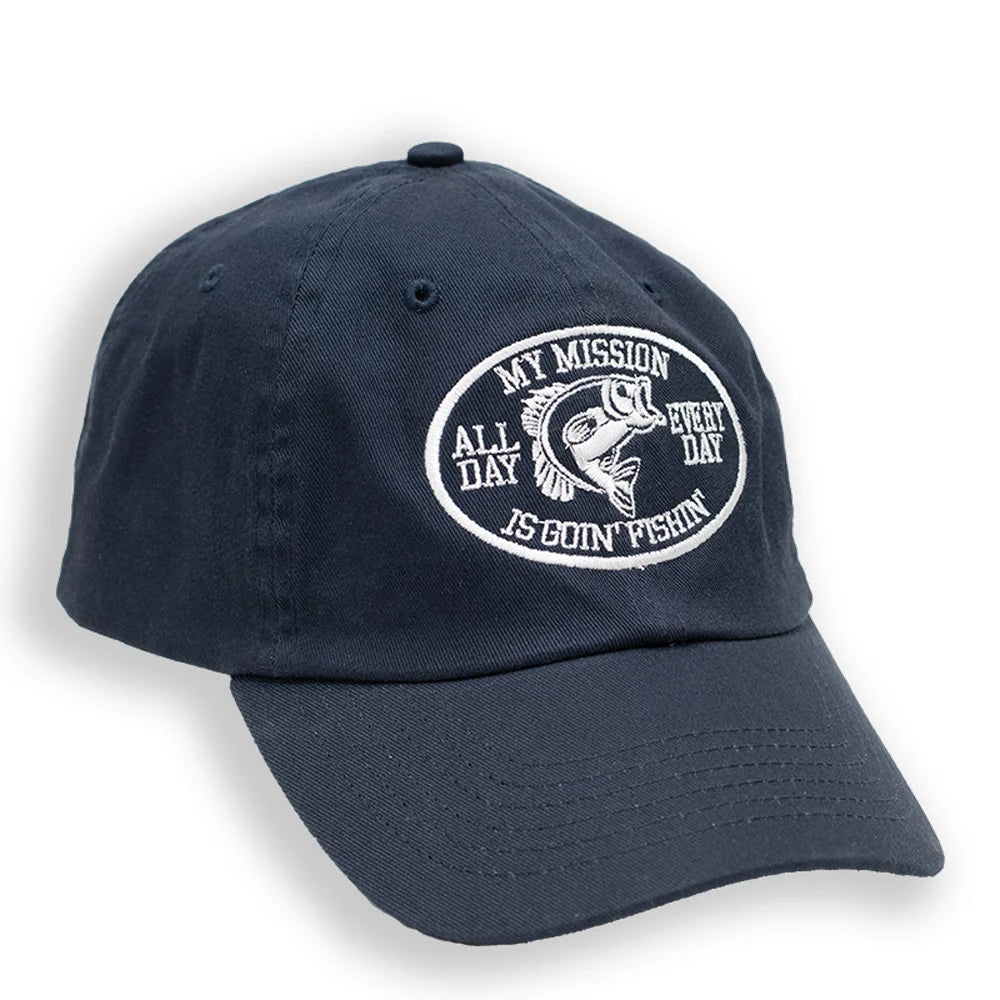 Reel in a good time with this laid-back fishing cap that says it all: "My Mission Is Goin’ Fishin’." Whether you’re casting off at sunrise or just dreaming of the lake from your porch, this cap keeps the vibe right. With a soft cotton feel, adjustable back strap, and classic two-tone style, it's made for sunny days, bait buckets, and tall tales. Wear it loud. Wear it proud. Fish on.