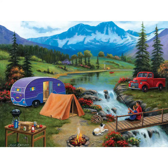 Experience the serenity of the great outdoors with John Zaccheo's captivating puzzle design. This scene showcases a picturesque mountain campsite complete with a cozy tent, a charming vintage camper, and a classic red truck by a tranquil stream. A father and daughter enjoy fishing on a quaint wooden bridge, while a crackling campfire and scenic mountain backdrop evoke the warmth of a perfect getaway. A delightful choice for nature enthusiasts and puzzle lovers.