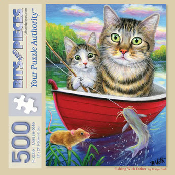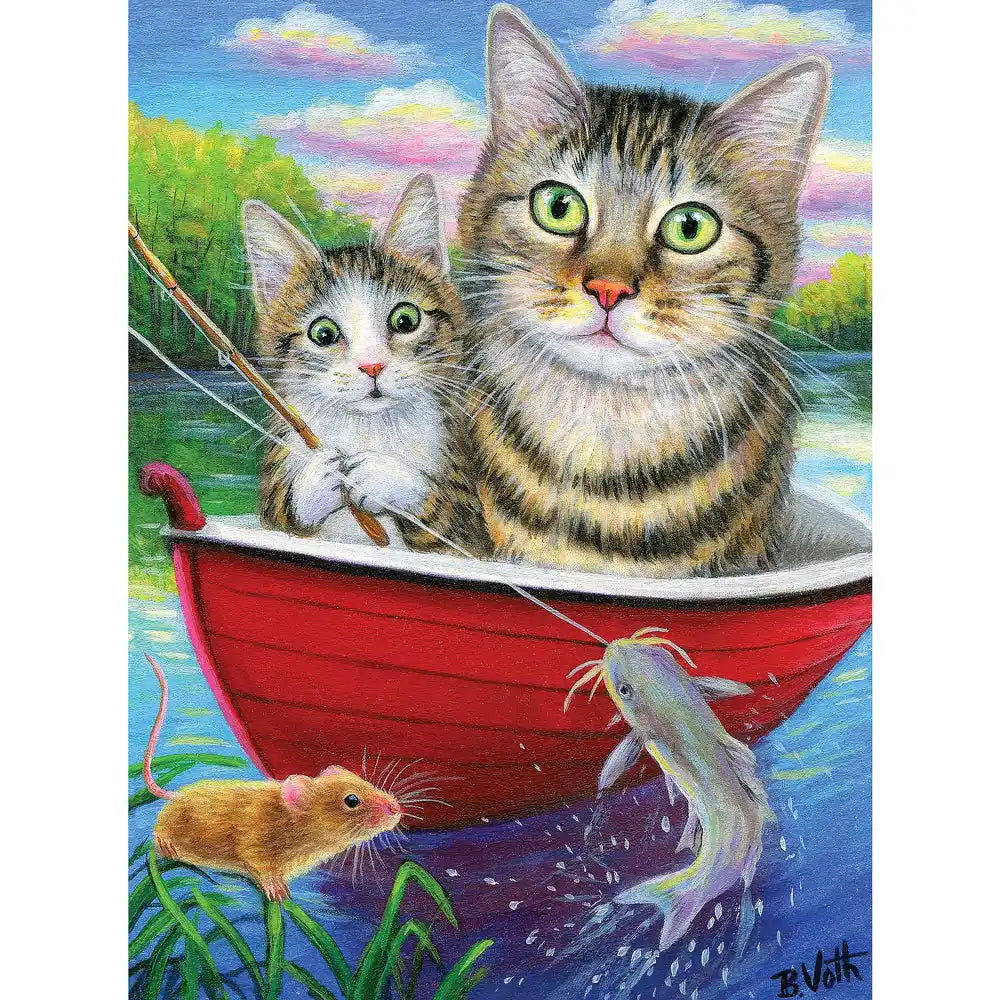 Fishing With Father by Bridget Voth is a heartwarming scene featuring a father cat and his kitten enjoying a day of fishing in a red rowboat. With wide-eyed wonder, the kitten clutches a fishing rod as a fish leaps from the water, while a curious mouse looks on from the shore. This whimsical jigsaw puzzle is available in both 300- and 500-piece counts and is perfect for cat lovers and animal enthusiasts alike.