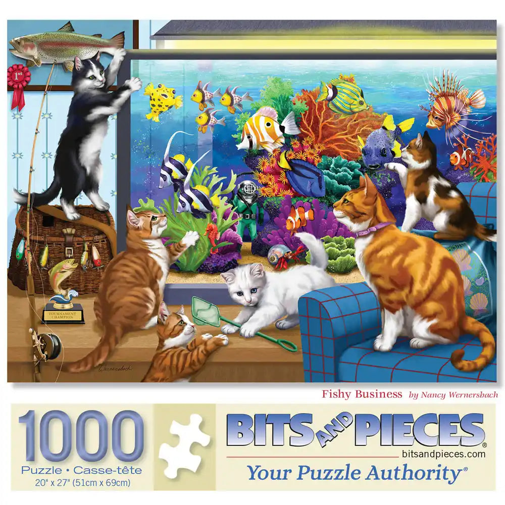 Dive into a whimsical scene with Bridget Voth's "Fishy Business" puzzle. This vibrant design captures curious cats captivated by a colorful aquarium, brimming with exotic fish and coral. Playful details, like a mischievous kitten reaching for a fish, make this puzzle a delightful challenge. Perfect for animal and puzzle lovers alike, it’s an imaginative escape into a humorous world of feline antics. Enjoy hours of fun piecing together this unique and lively artwork.