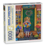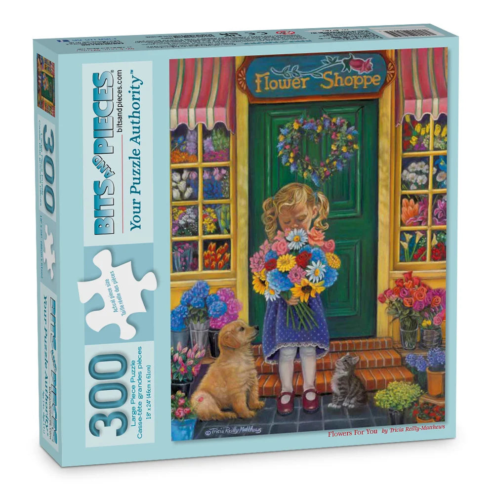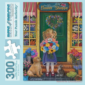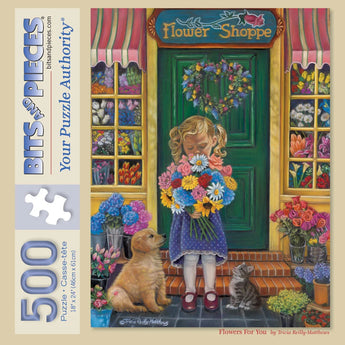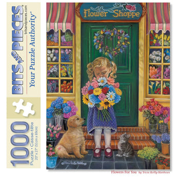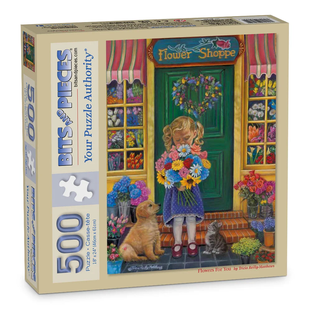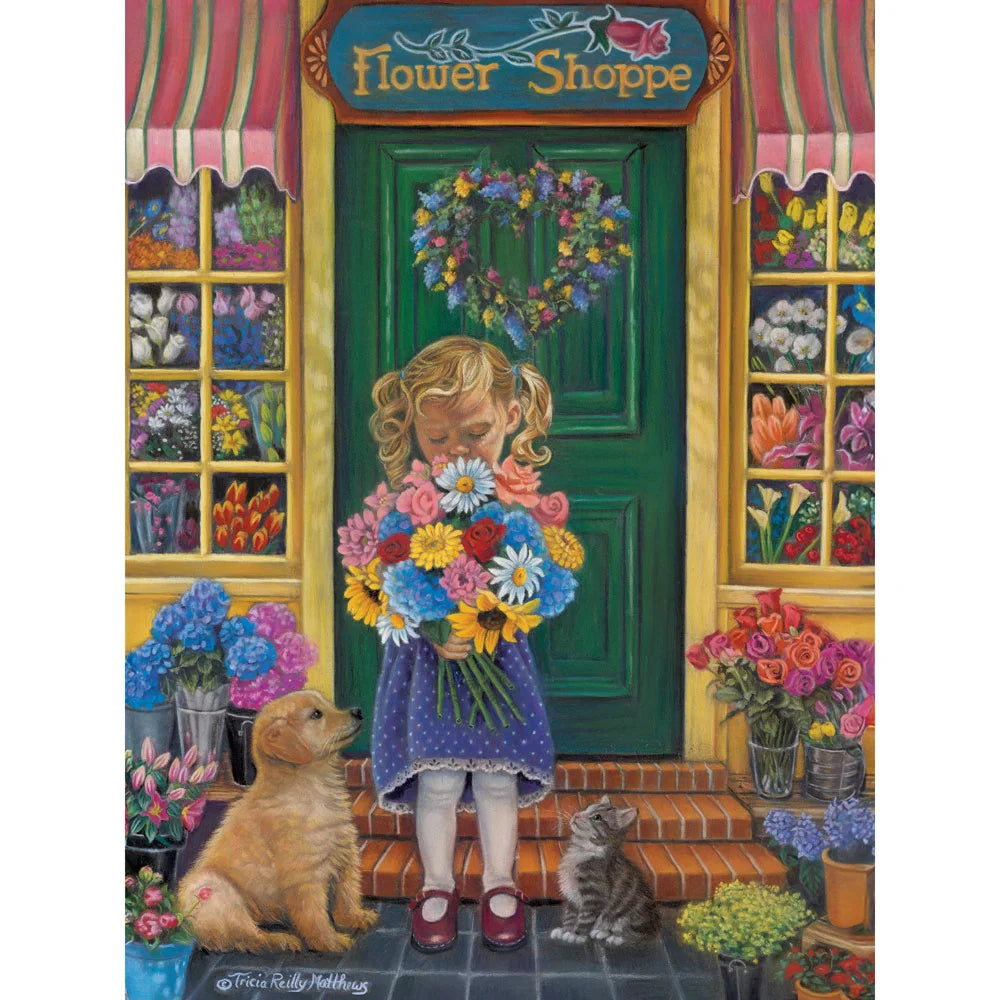 With a shy smile and a bouquet too big to hold, Flowers for You by Tricia Reilly-Matthews captures the purest kind of love—sweet, simple, and sincere. Outside a charming flower shop, a little girl stands between a loyal pup and a curious kitten, ready to brighten someone’s day. This heartfelt puzzle is a tender reminder that the smallest gestures often mean the most.