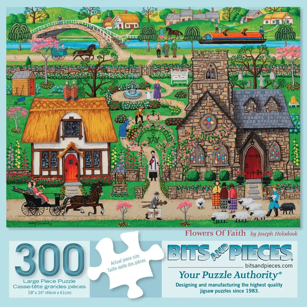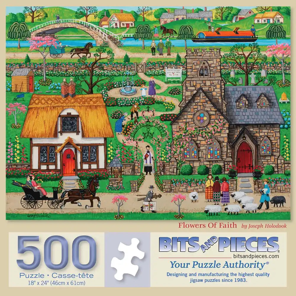 Step into a blooming sanctuary with this jigsaw puzzle, where every piece lovingly captures a quaint village scene brimming with floral splendor. Designed by Joseph Holodook, the artwork weaves a story of a community rooted in harmony and beauty charming . Stroll through the lush gardens, admire the stained-glass chapel, and enjoy the simple joys of pastoral life. This puzzle is not just an activity, but a journey through a world where every hedge and stone tells a tale. Perfect for enthusiasts of all skill levels, and also available in a different piece count for those seeking a varied challenge.Available in two piece count. Puzzles consisting of 500 pieces are perfect for both intermediate puzzle enthusiasts and group activities.