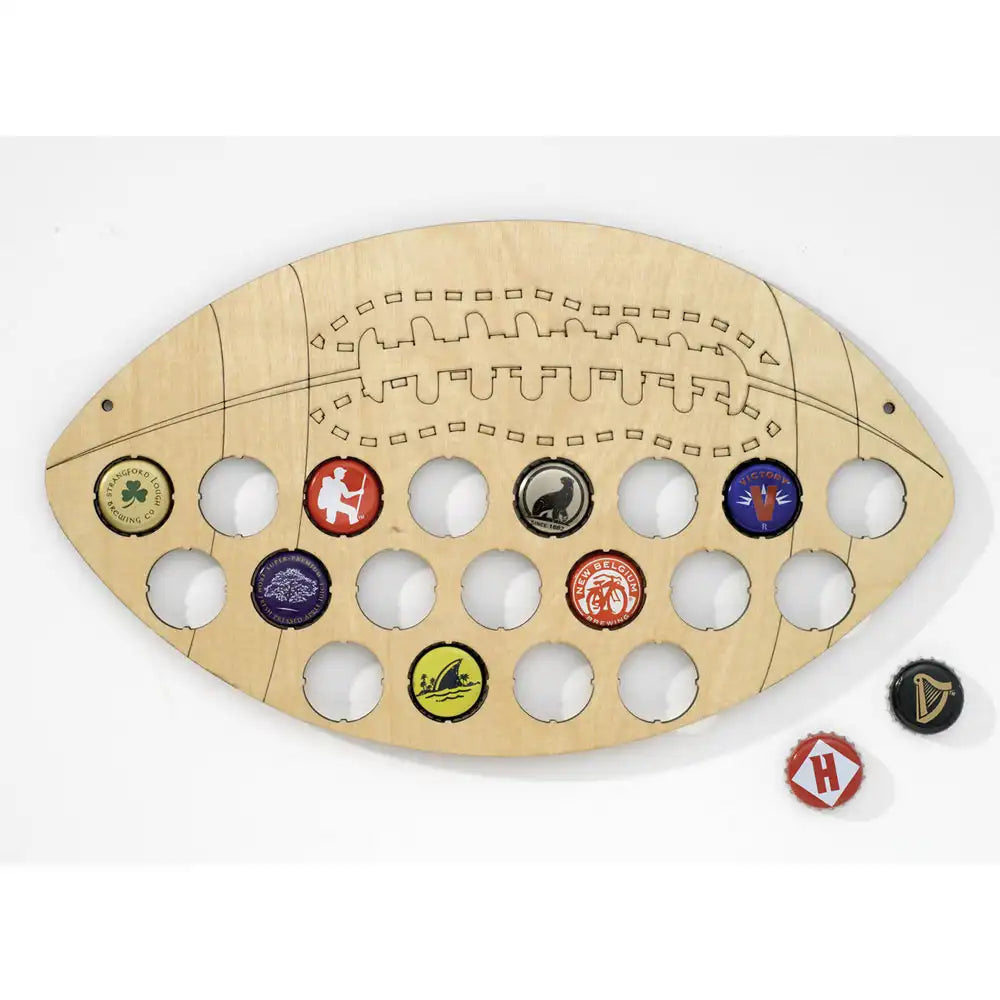 Our laser etched bottle cap trap holds 19 of your favorite bottle caps! Made in the USA from 1/4" birch wood. Mounting holes are located at each end to display on a wall. Measures 7-3/4" x 13"