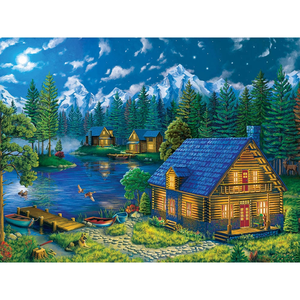 The perfect secluded spot, and a true fisherman's dream. This secluded log cabin on the lake has the perfect spot on the channel, with neighbors just close enough to share in a backyard barbecue. Light shines through the windows as the inhabitants gather after a busy day of boating, fishing, and enjoying all that nature has to offer at this lake in the mountains. This jigsaw puzzle features so many satisfying textures–the needle-laden pine trees, the smooth cobblestone drive, and the snow-topped mountains for starters. This large-piece puzzle will have you feeling the cool mountain breeze!