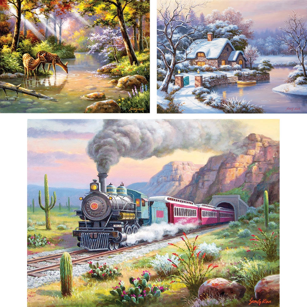 Piece together a welcoming winter scene: a cozy stone cottage is tucked under a layer of soft, just-fallen snow. Inside, cozy lights suggest a sweet winter's night. Sung Kim is a contemporary artist known for his serene and atmospheric landscape paintings, often capturing the beauty of nature. His works are characterized by a peaceful, almost dreamlike quality, with soft colors and delicate lighting that evoke calm and reflection. Sung Kim often portrays tranquil scenes with a sense of stillness. 1,000 pieces fit together in our classic 20" x 27" size.