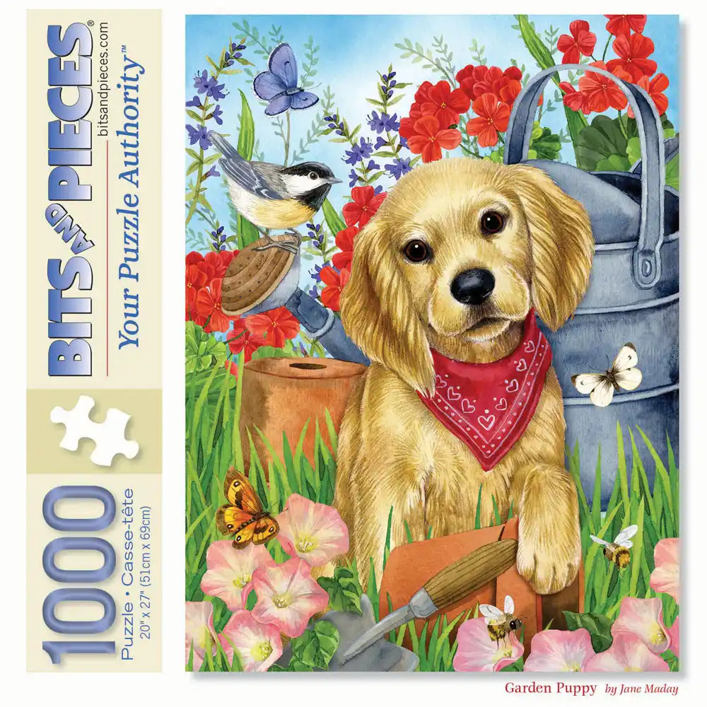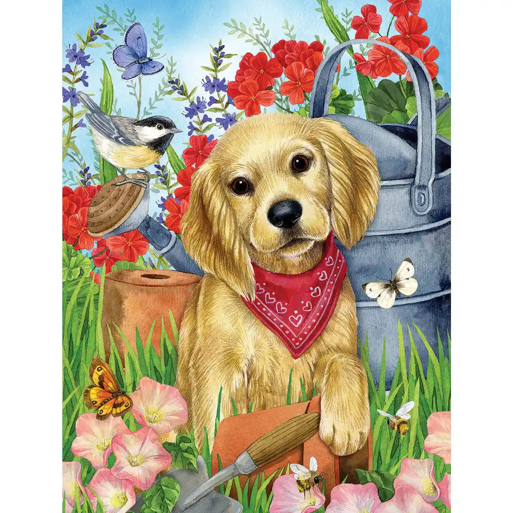 Brighten your day with this charming jigsaw puzzle by Jane Maday. Featuring an adorable golden puppy wearing a red bandana, this garden scene is bursting with vibrant flowers, fluttering butterflies, and cheerful birds. Perfect for nature and dog lovers, this puzzle combines delightful imagery with a satisfying challenge. Once completed, it makes a heartwarming display or gift for any occasion.