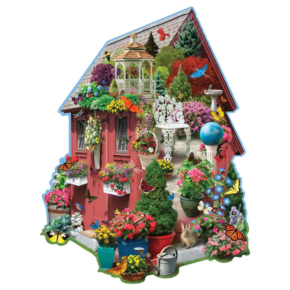 Explore a beautiful blooming garden within our serene garden shed shaped puzzle. A fun puzzle challenge by artist Alan Giana. Available in multiple piece count, each measuring 20" x 27".