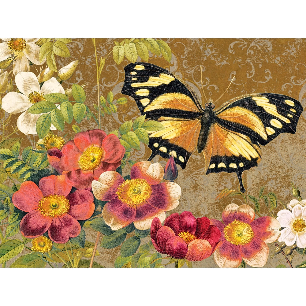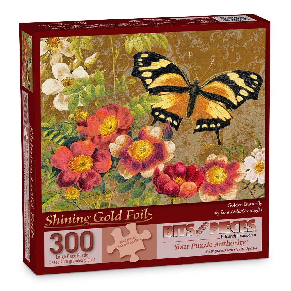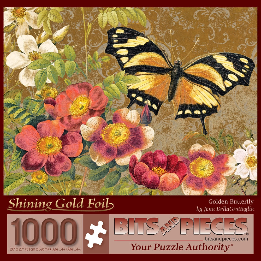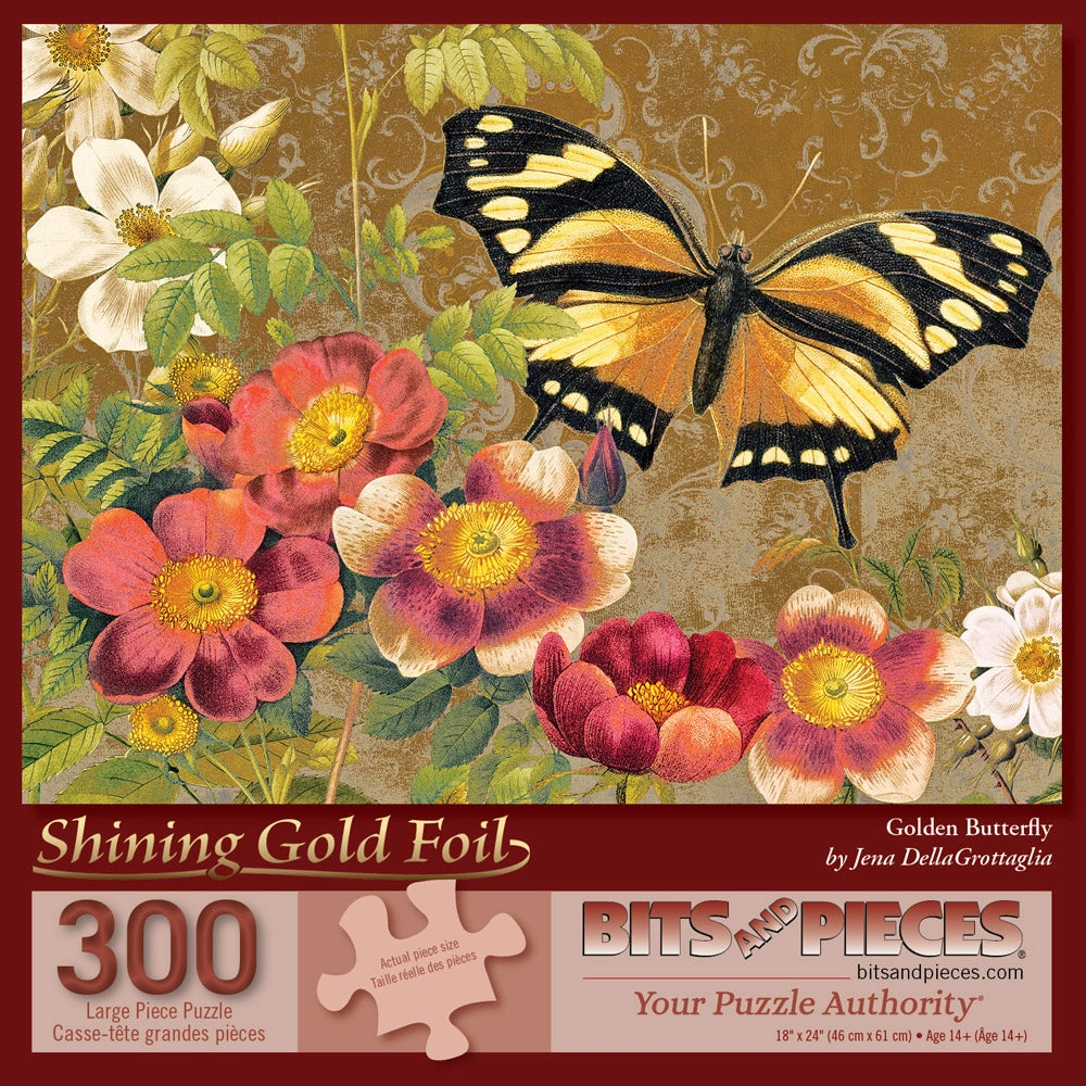 Delicate and radiant, the Golden Butterfly puzzle blends soft florals with glowing foil accents. A butterfly with outstretched wings rests gently on blooming flowers, all framed in warm golden tones. This elegant jigsaw puzzle is perfect for anyone who loves nature, beauty, and a little sparkle.