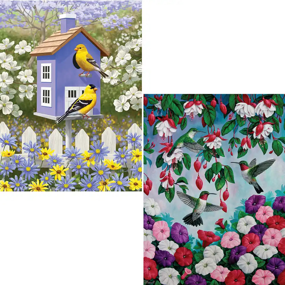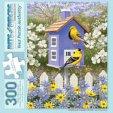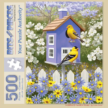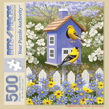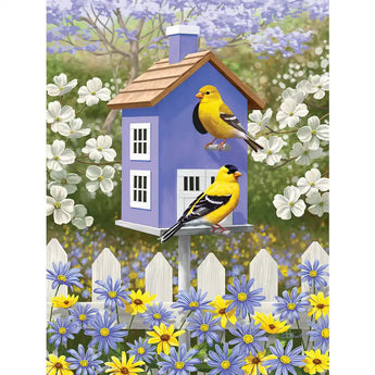 Crista Forest's charming puzzle showcases a vibrant scene featuring two goldfinches perched on a delightful purple birdhouse, surrounded by blooming flowers and a white picket fence. The pastel shades of white blossoms and yellow daisies create a serene and picturesque garden setting. This design radiates tranquility and the beauty of nature, making it a perfect puzzle for bird lovers and gardening enthusiasts alike.