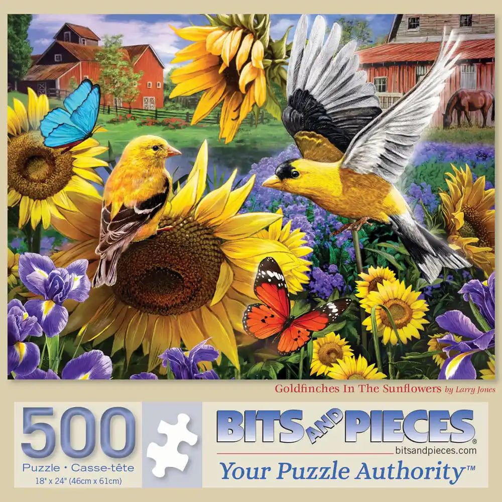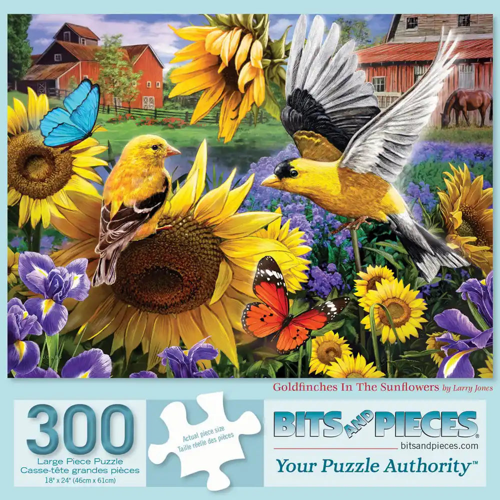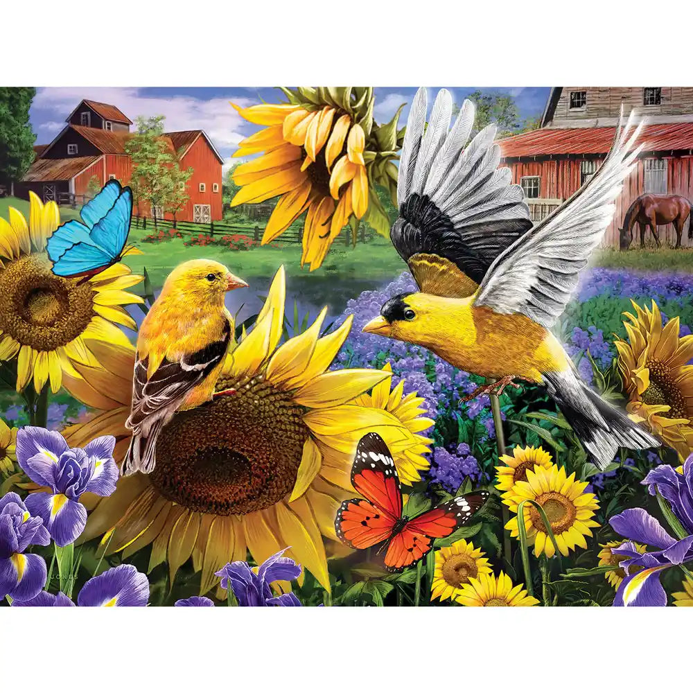 Bring a burst of summer color to your puzzle table with Goldfinches in the Sunflowers by Larry Jones. This vibrant jigsaw puzzle showcases bright yellow goldfinches perched among blooming sunflowers, butterflies, and lush garden scenery. With rich farmstead details in the background and radiant florals in the foreground, this nature-filled design is a delightful challenge for all ages. Available in multiple piece counts to suit your preference.