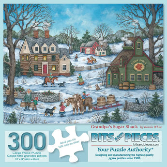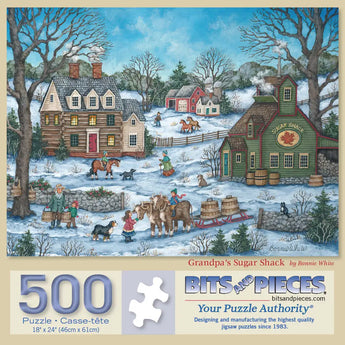 Warm up to the cozy charm of Grandpa's Sugar Shack, a delightful puzzle by Bonnie White. This wintry scene captures the timeless tradition of making maple syrup, with horse-drawn wagons carrying barrels of sap to a quaint sugar shack. Snow-dusted trees, rustic cabins, and friendly farm animals bring this picturesque countryside to life, offering a heartwarming glimpse of a winter day on the farm.