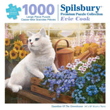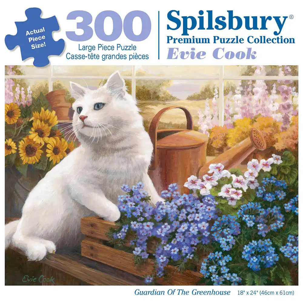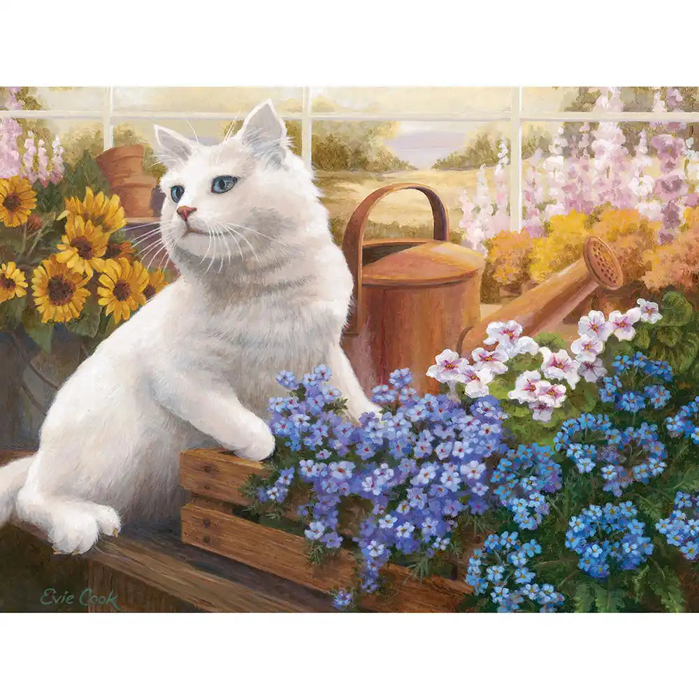 Delight in the serenity of a greenhouse scene with this charming puzzle by Evie Cook. Featuring a fluffy white cat nestled among vibrant flowers, this puzzle captures a tranquil moment in a sunlit greenhouse, perfect for cat lovers and gardeners alike.