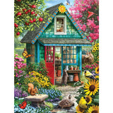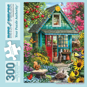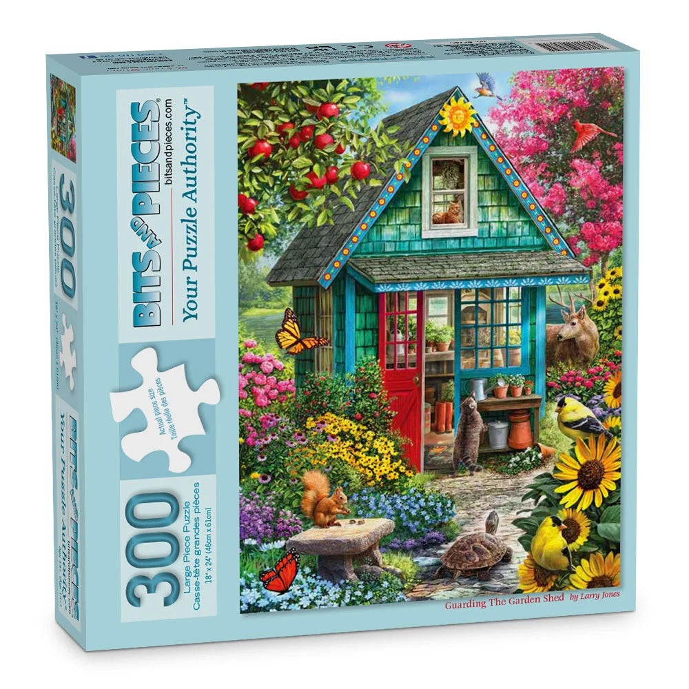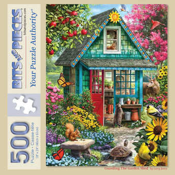 Step into a charming backyard haven with Guarding the Garden Shed by Larry Jones! This vibrant puzzle captures a whimsical scene where nature and curiosity meet. A curious cat watches from the window of a teal garden shed, while a squirrel enjoys a snack, a rabbit stands on alert, and a turtle explores the stone path. Bright sunflowers, blooming roses, and apple trees frame the shed, while colorful birds and butterflies flutter about. With every piece, you’ll discover new furry and feathered friends, making this puzzle a delightful celebration of garden life.