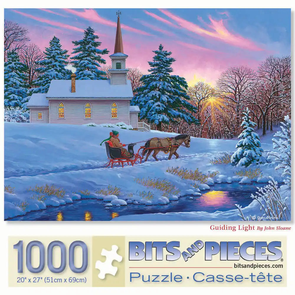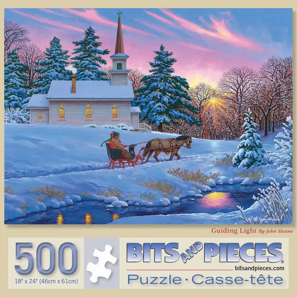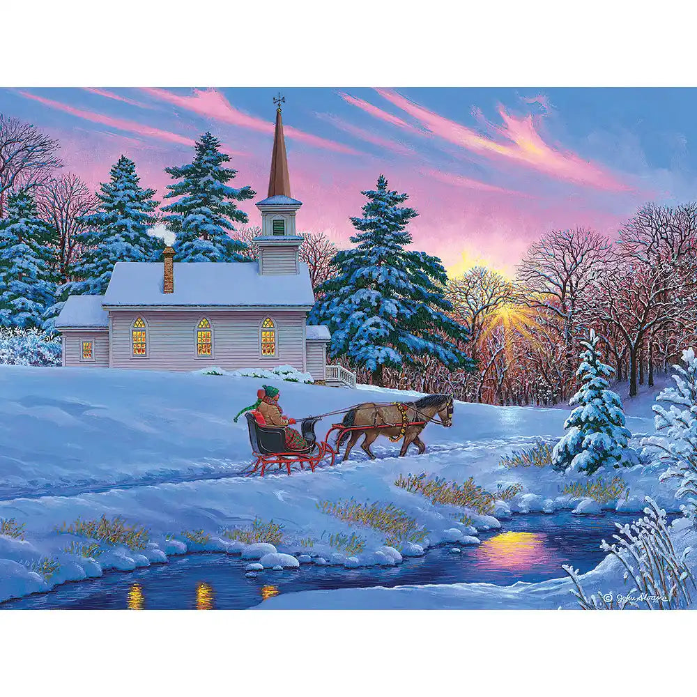 Experience the peaceful charm of a winter’s evening with "Guiding Light" by John Sloane. A snow-covered chapel glows warmly against the fading hues of sunset, while a horse-drawn sleigh glides gently along the icy stream. Frosted evergreens frame the serene scene, evoking the timeless beauty of simpler days. Let this tranquil puzzle transport you to a cozy moment of nostalgia and seasonal joy.