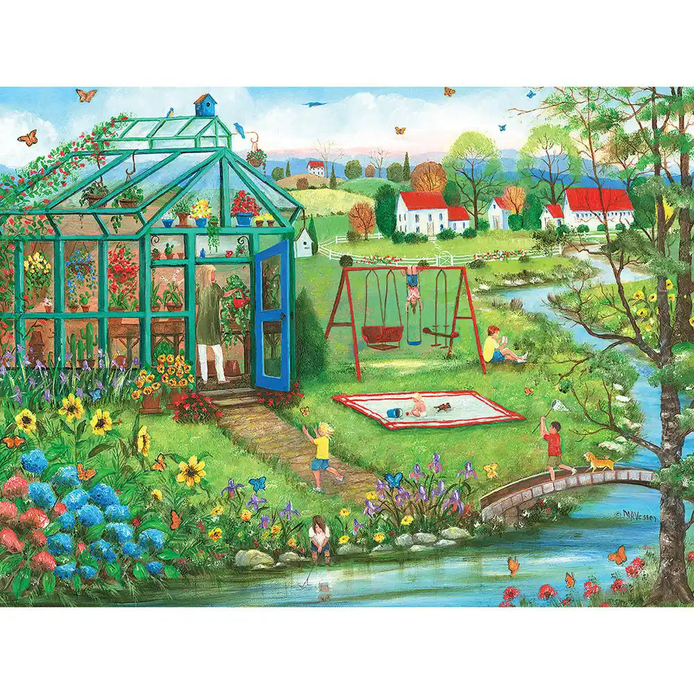 Step into a world of serenity with the Happy Days 1000-Piece Jigsaw Puzzle. Illustrated by Mary Ann Vessey, this heartwarming 20" x 27" countryside scene captures a picturesque moment. Children laugh and play near a tranquil pond, while a vibrant greenhouse brims with colorful blooms. Rolling hills, fluttering butterflies, and charming cottages complete this peaceful setting, perfect for a cozy puzzling session.