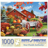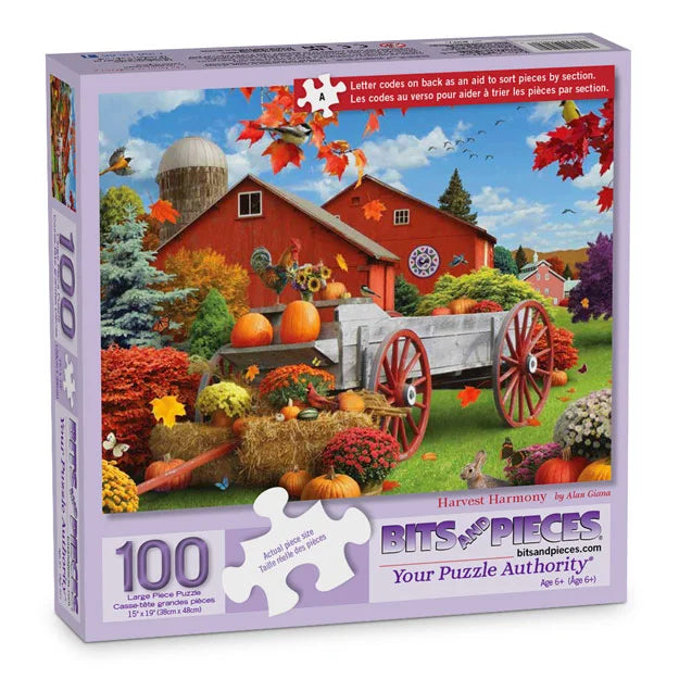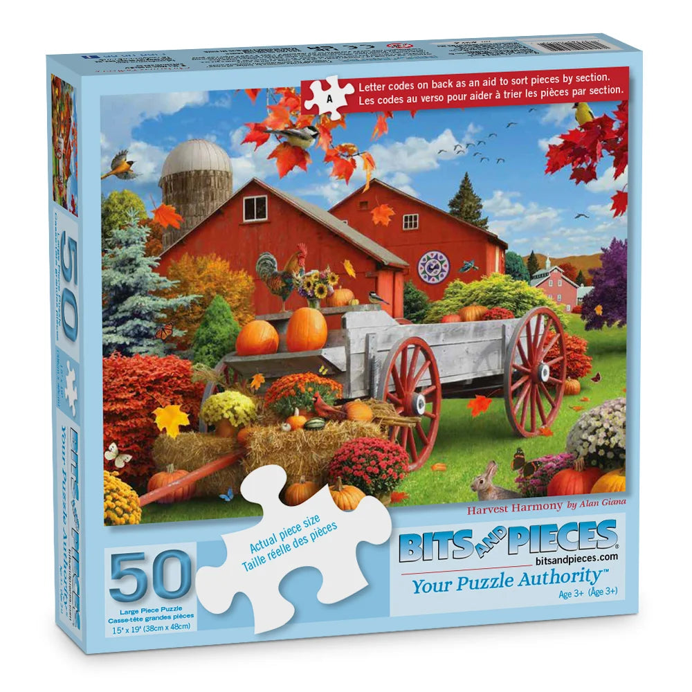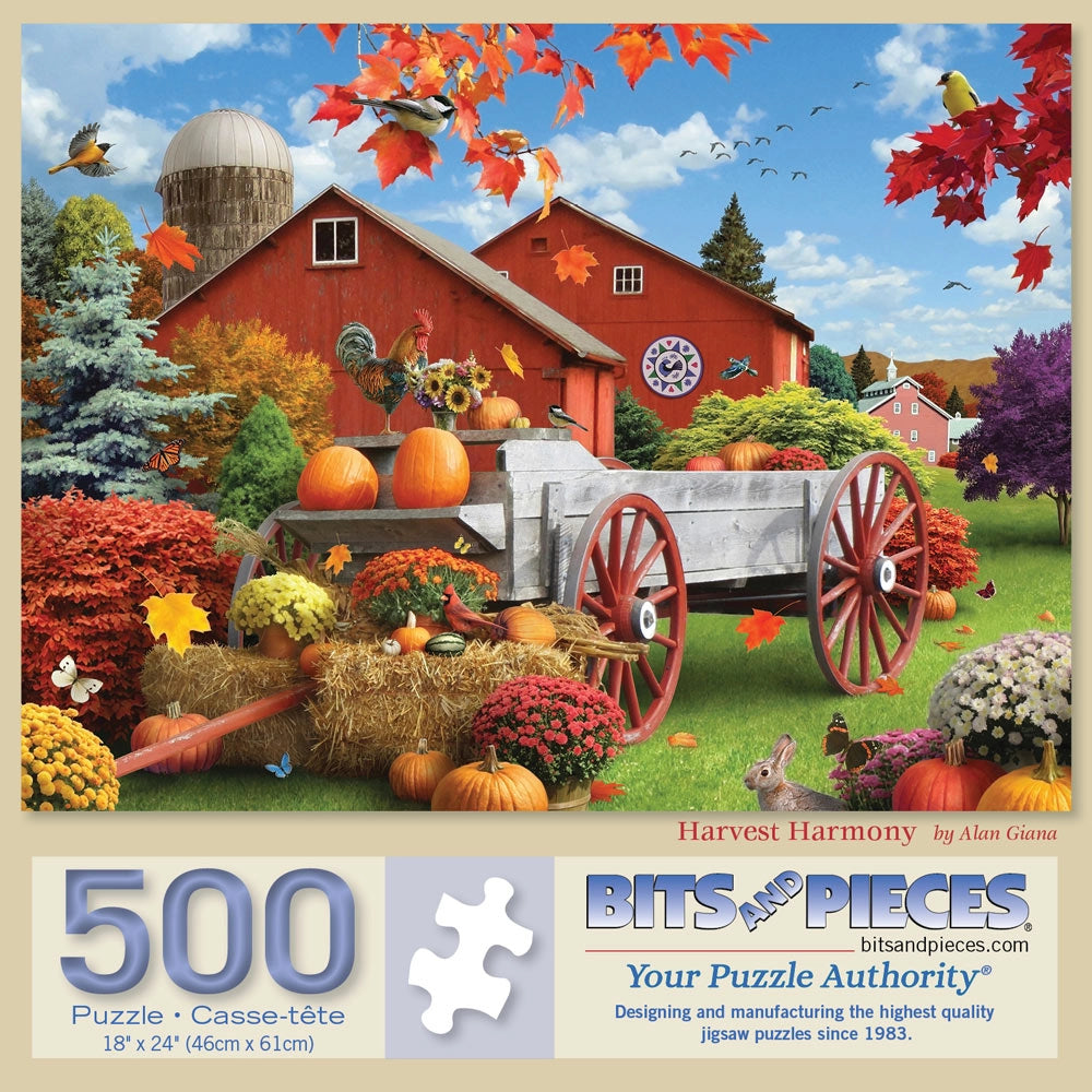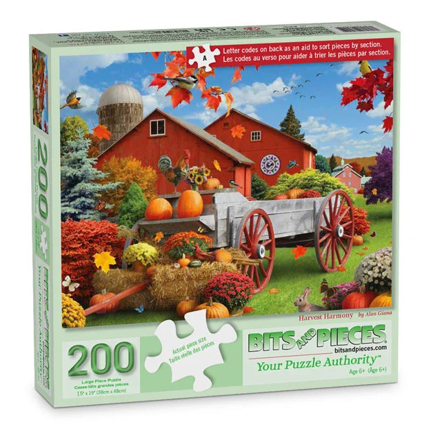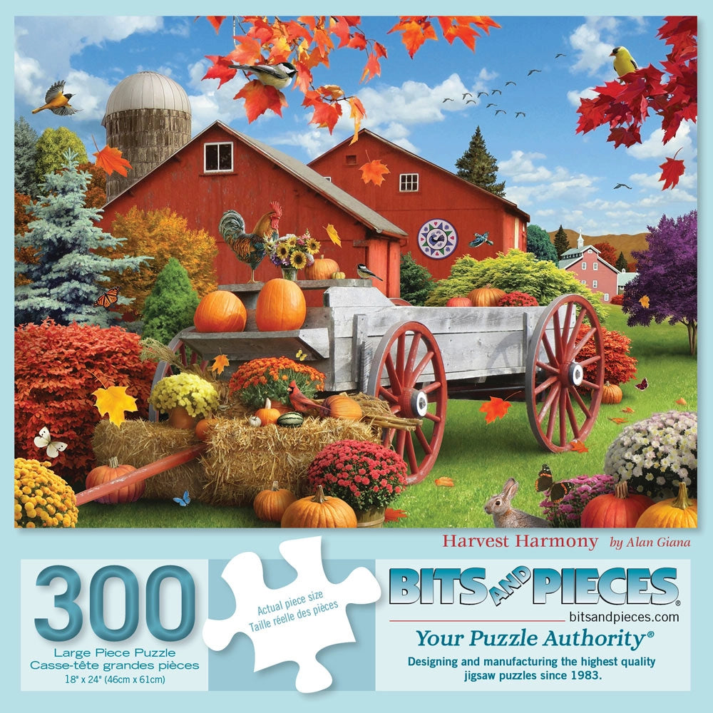 The results of a hard season's work: it's finally time for harvest. This large-piece puzzle depicts a pastoral scene of a hay wagon loaded with pumpkins. The farmer has stepped away, leaving a proud rooster and a few onlooking bunnies in charge. This puzzle is another from Alan Giana, one of our favorite artists. Giana is known for his colorful and idyllic landscape paintings that depict peaceful and scenic outdoor settings. His style is characterized by vibrant colors, fine details, and a sense of warmth and serenity, making his paintings evoke a sense of peacefulness and escape.