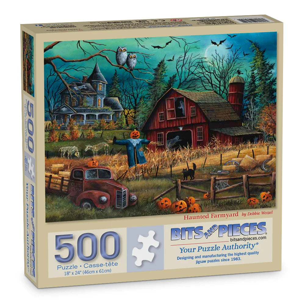 Something spooky’s stirring in the Haunted Farmyard jigsaw puzzle by Debbie Wetzel! A jack-o’-lantern-headed scarecrow stands guard over a ghostly red barn as bats swirl, owls perch, and shadows dance in the eerie twilight. With crooked trees, an abandoned truck, and just the right dose of creepy fun, this puzzle is perfect for Halloween night... or any night you want a fright!