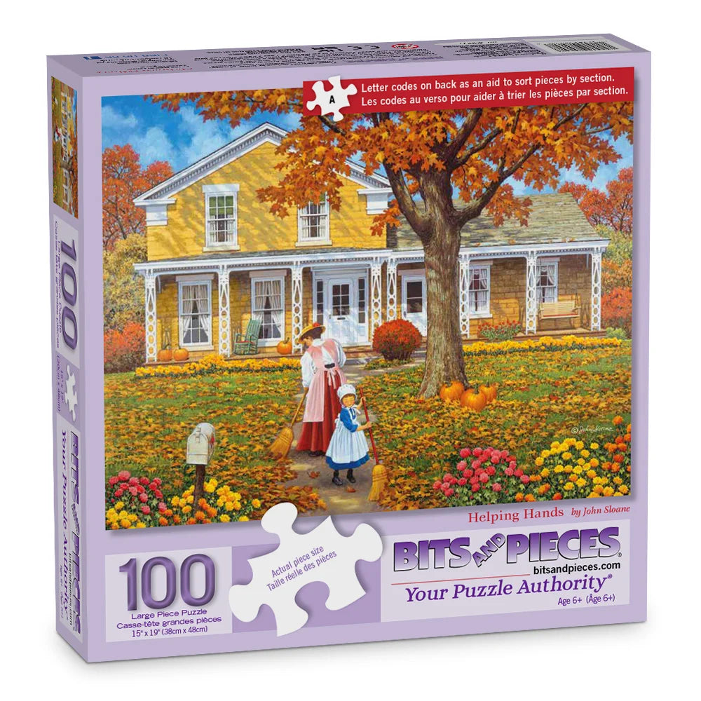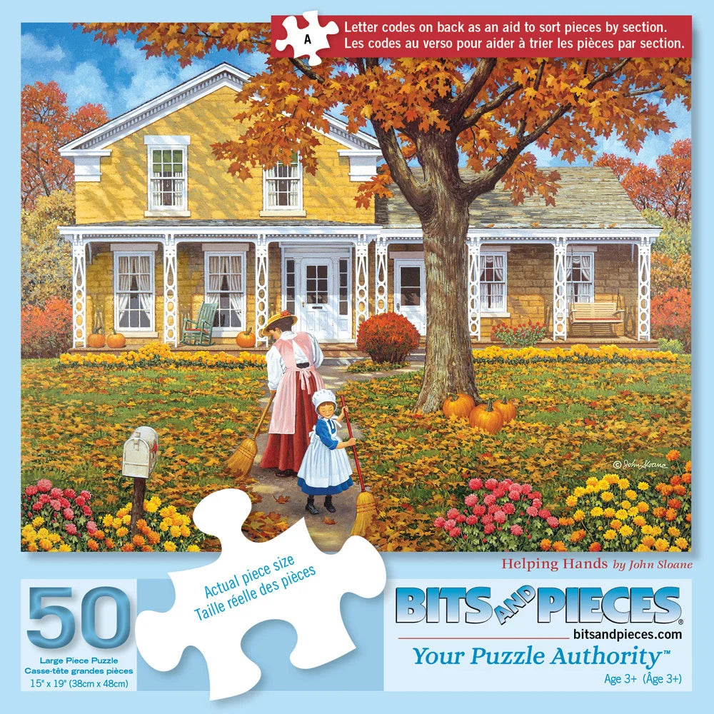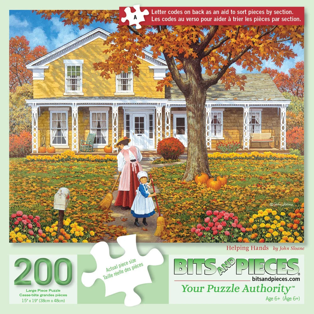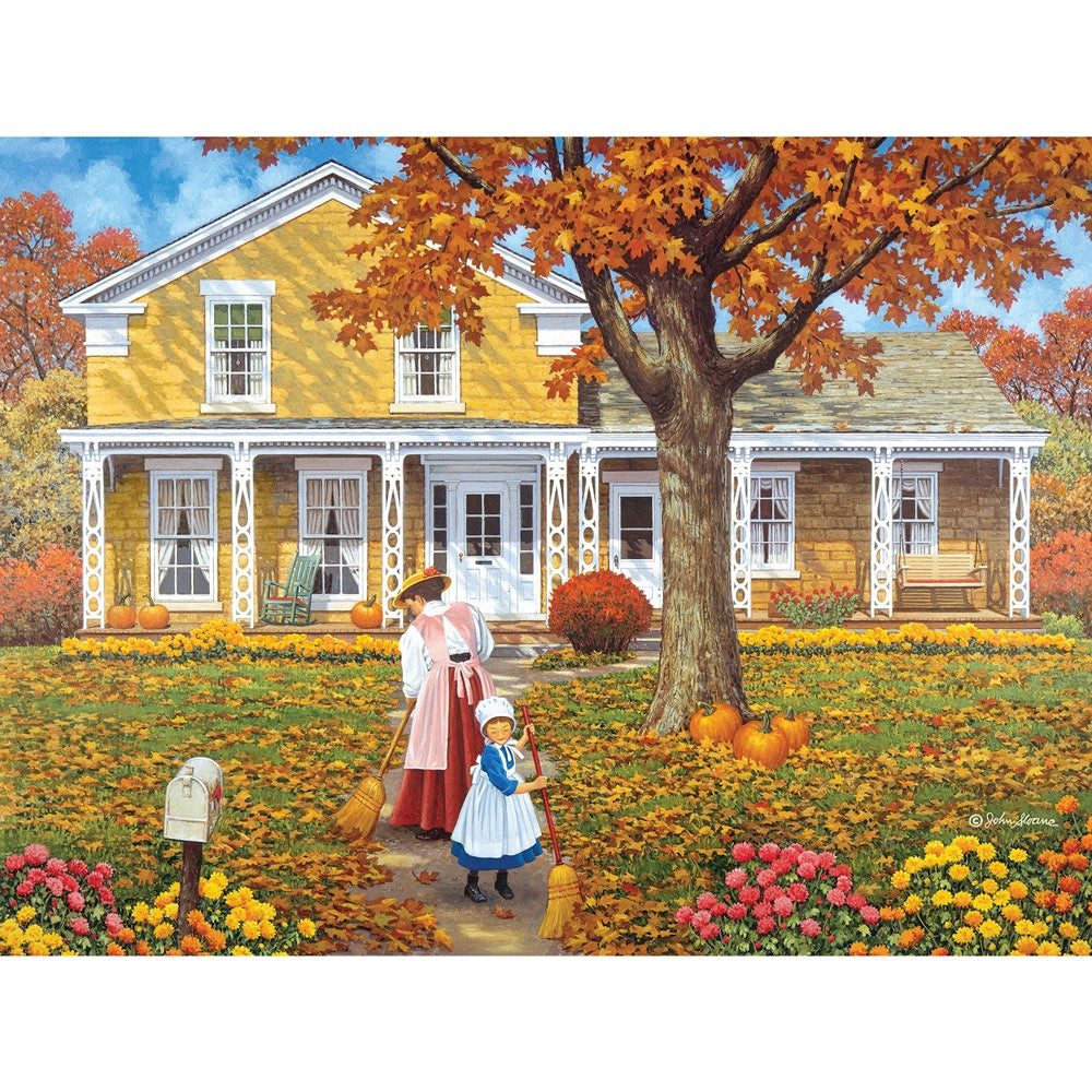 Dive into the warmth of fall with this delightful puzzle by John Sloane. Available in 300, 500, and 1000-piece counts, this scene beautifully captures a serene autumn afternoon. In the foreground, a mother and daughter team up to sweep a colorful blanket of fallen leaves in front of their inviting yellow home. Fall flowers gracefully edge the walkway, adding vibrant touches to the picturesque setting. An ancient oak tree stands proudly nearby, its branches adorned with the season’s hues, while three cheerful pumpkins rest at its base. John Sloane’s artful depiction of this cozy autumn scene invites you to savor the simple joys of the season. Whether you’re a seasoned puzzler or a newcomer, this puzzle offers a relaxing and rewarding experience, perfect for celebrating fall’s charm and beauty.