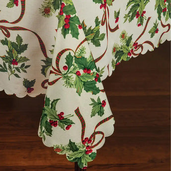 Celebrate the spirit of the season with this pretty tablecloth. Cream background makes the holly leaves, pine branches and tartan ribbons pop, while the scalloped edge adds a touch of sophistication. Easy care polyester. Machine wash. Specify size.