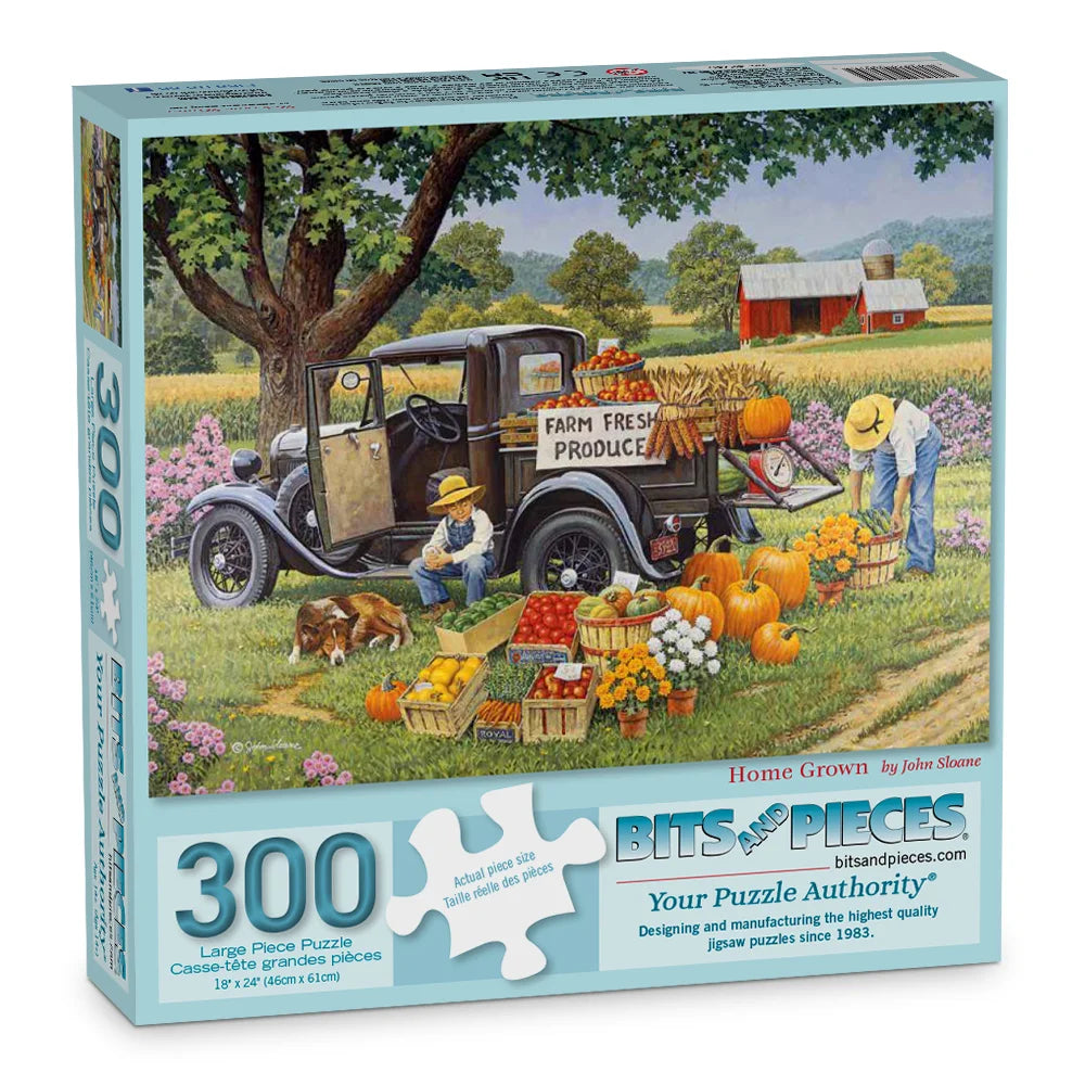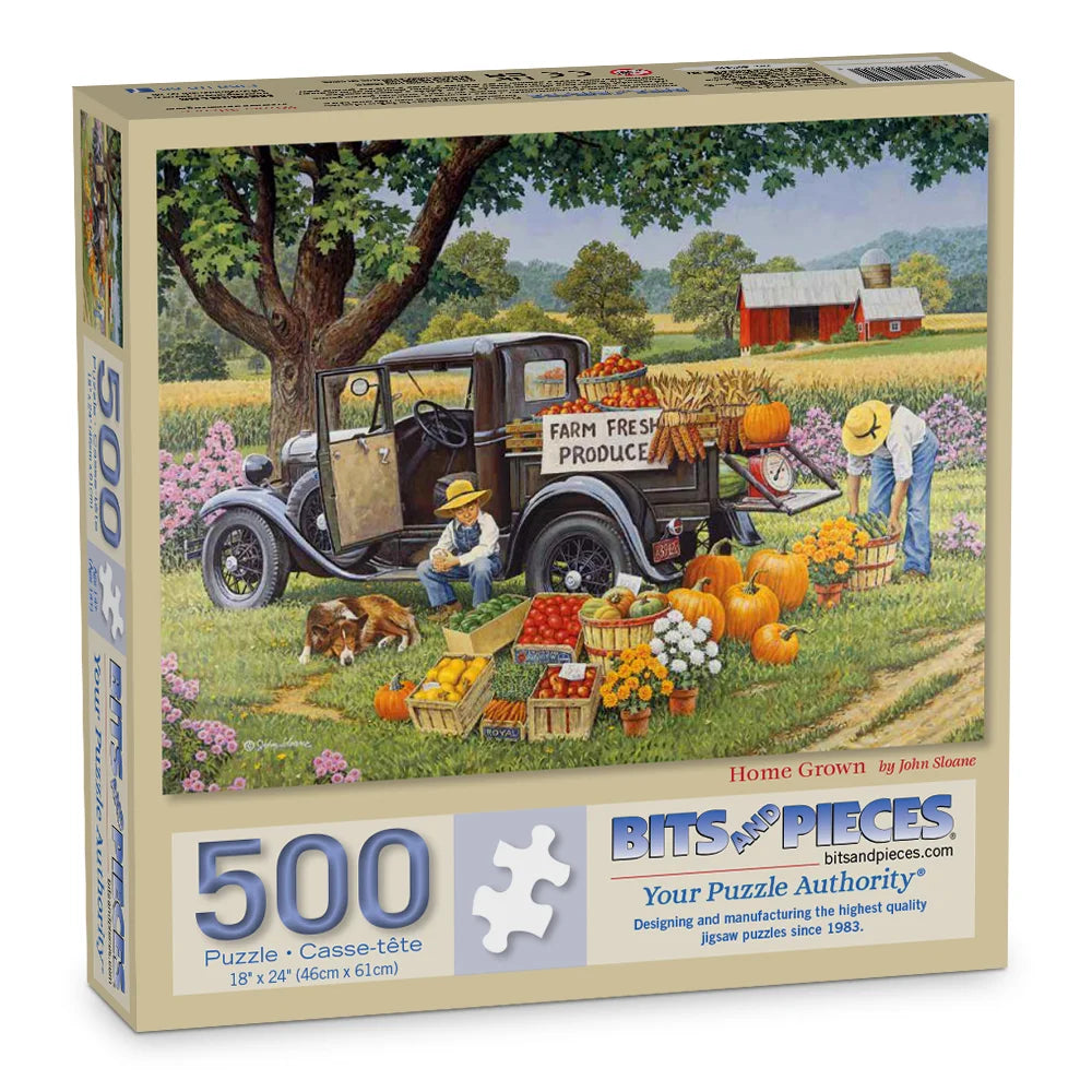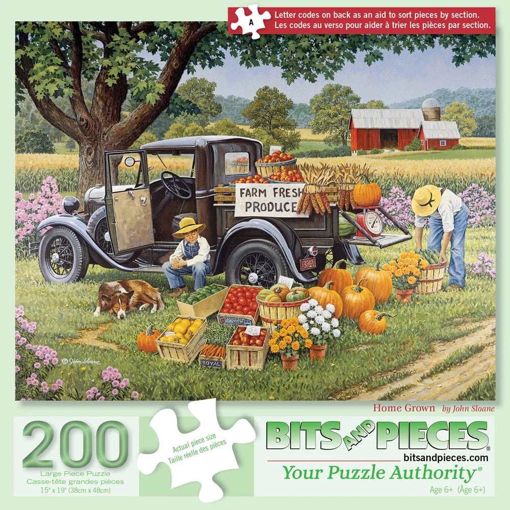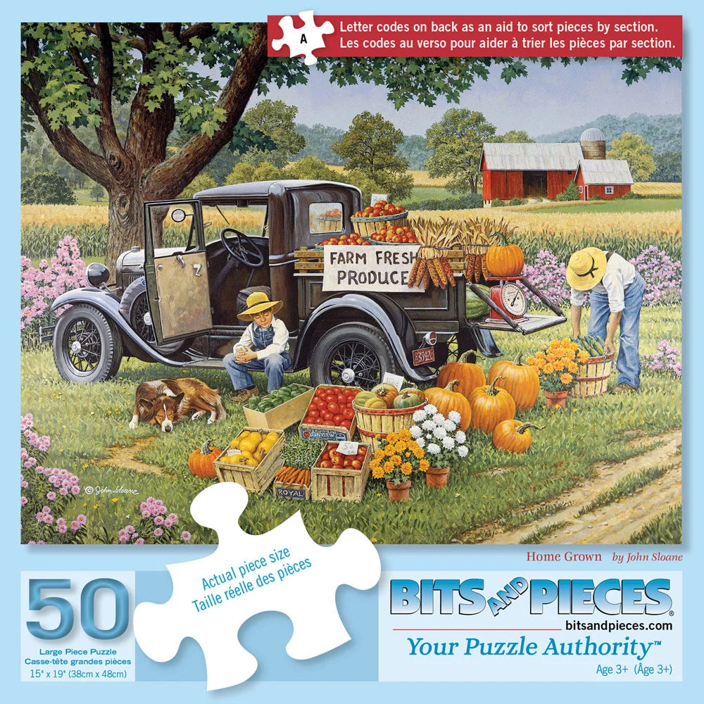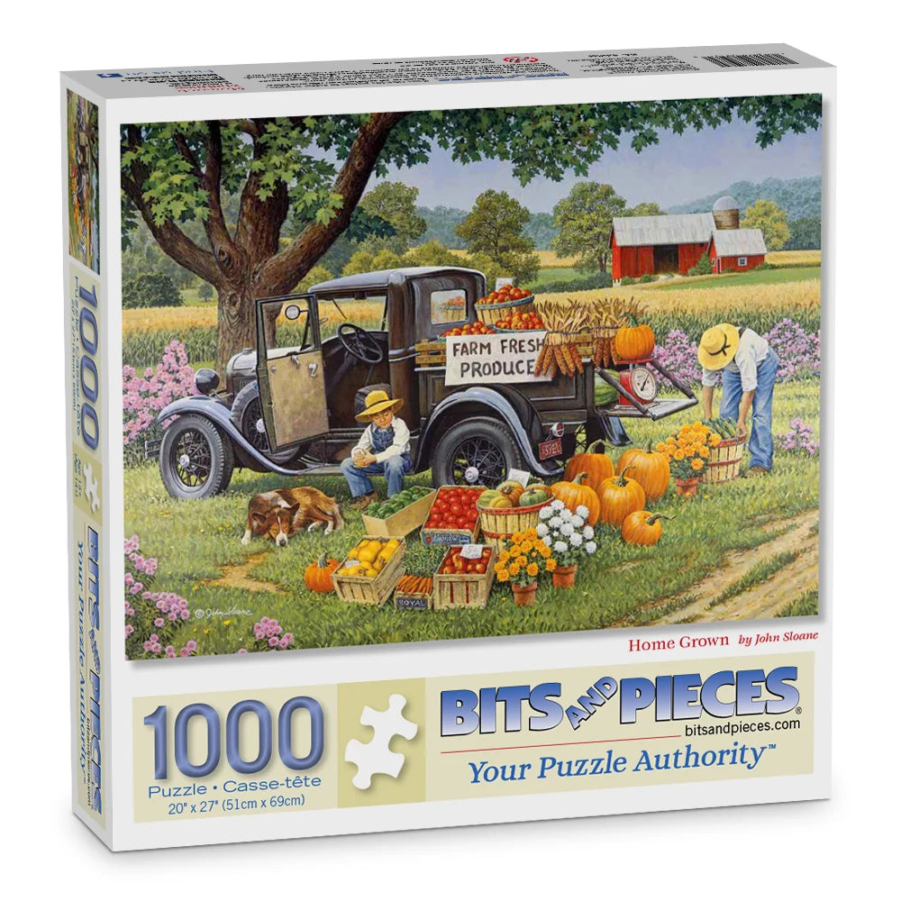 This jigsaw puzzle is designed by John Sloane and available in multiple piece counts. Amidst a rustic countryside backdrop, a vintage black truck laden with a bounty of fresh produce, including pumpkins, apples, carrots, and corn, beckons to passersby. By the truck's side, a loyal dog keeps watch as a father unloads the harvest, all against the picturesque backdrop of a proud red barn, evoking a heartwarming, idyllic scene.